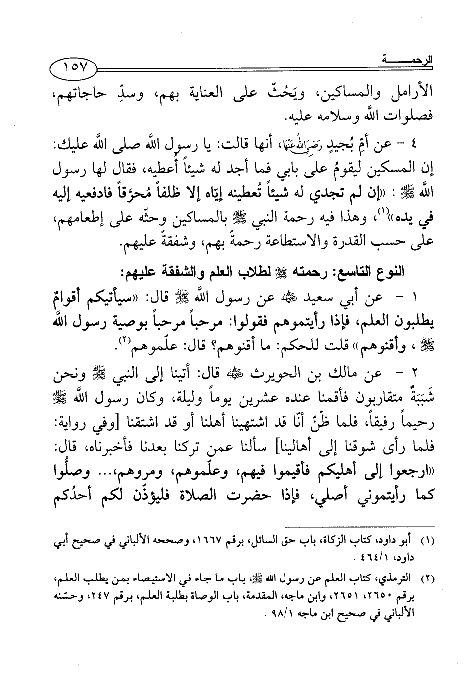 4 - عن أمِّ بُجيدٍ رَضِيَ اللهُ عَنْهَا، أنها قالت: يا رسول اللَّه صلى اللَّه عليك: إن المسكين ليقومُ على بابي فما أجد له شيئاً أُعطيه، فقال لها رسول اللَّه - صلى الله عليه وسلم -: «إن لم تجدي له شيئاً تُعطينه إيّاه إلا ظلفاً مُحرَّقاً فادفعيه إليه في يده» (¬1)، وهذا فيه رحمة النبي - صلى الله عليه وسلم - بالمساكين وحثّه على إطعامهم، على حسب القدرة والاستطاعة رحمةً بهم، وشفقةً عليهم.