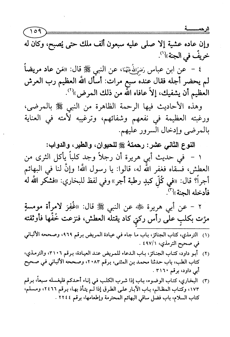 1 - في حديث أبي هريرة أن رجلاً وجد كلباً يأكل الثرى من العطش، فسقاه فغفر اللَّه له، قالوا: يا رسول اللَّه! وإنَّ لنا في البهائم أجراً؟ قال: «في كُلِّ كبدٍ رطبة أجر» وفي لفظ للبخاري: «فشكر اللَّه له فأدخله الجنة» (¬3).