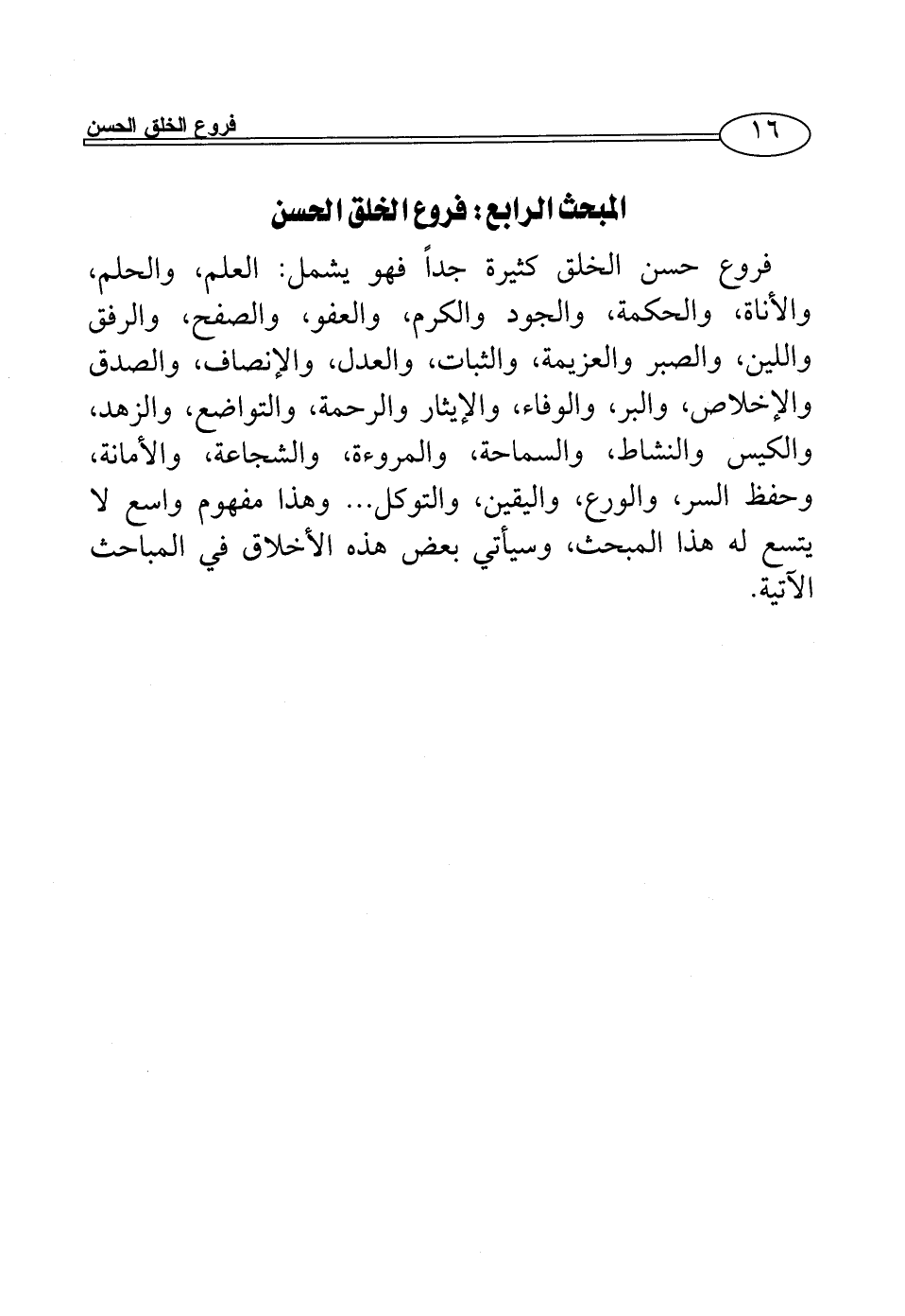 فروع حسن الخلق كثيرة جداً فهو يشمل: العلم، والحلم، والأناة، والحكمة، والجود والكرم، والعفو، والصفح، والرفق واللين، والصبر والعزيمة، والثبات، والعدل، والإنصاف، والصدق والإخلاص، والبر، والوفاء، والإيثار والرحمة، والتواضع، والزهد، والكيس والنشاط، والسماحة، والمروءة، والشجاعة، والأمانة، وحفظ السر، والورع، واليقين، والتوكل ... وهذا مفهوم واسع لا يتسع له هذا المبحث، وسيأتي بعض هذه الأخلاق في المباحث الآتية.