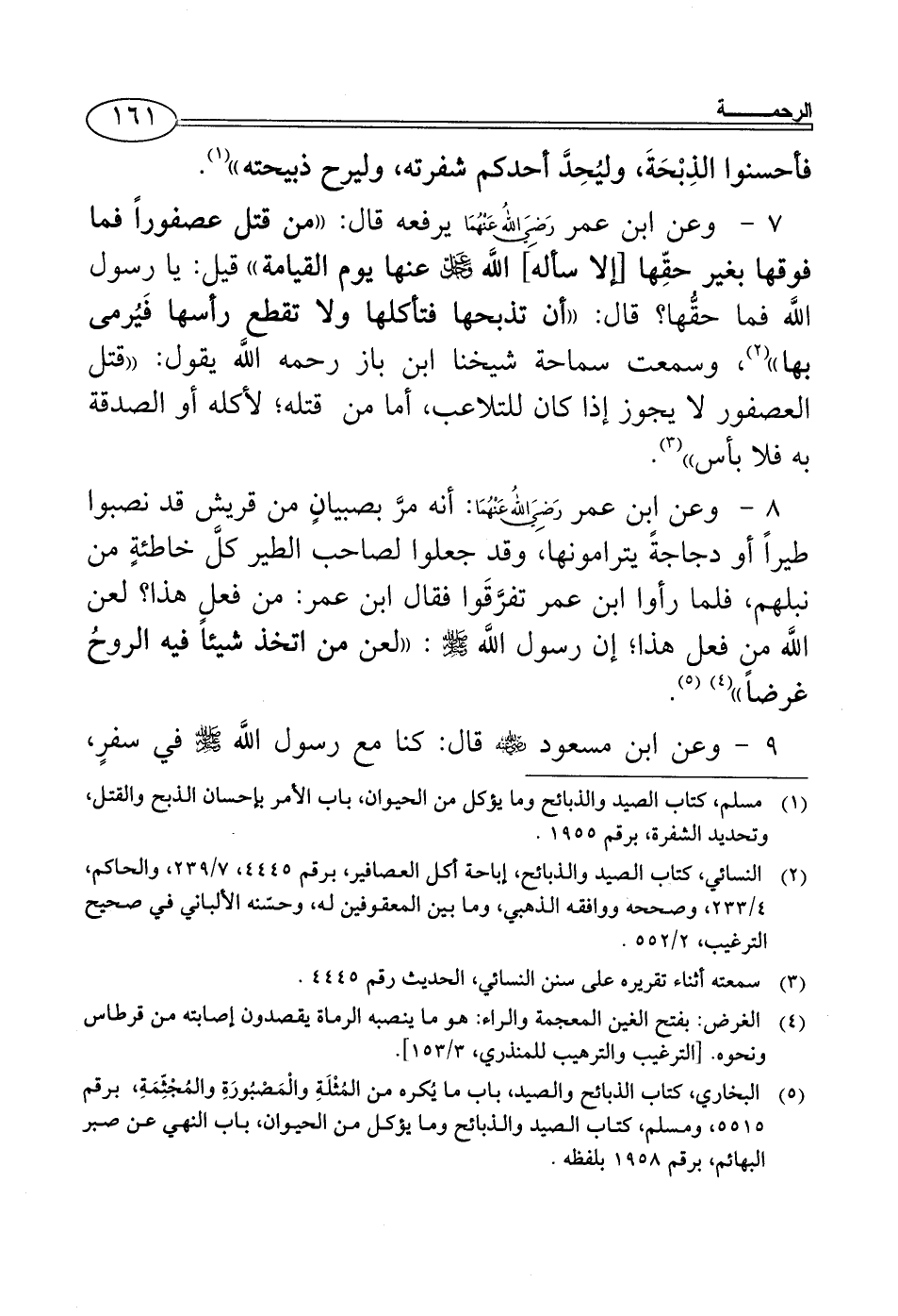 (¬5) البخاري، كتاب الذبائح والصيد، باب ما يُكره من المُثْلَةِ والْمَصْبُورَةِ والمُجْثِّمَةِ، برقم 5515، ومسلم، كتاب الصيد والذبائح وما يؤكل من الحيوان، باب النهي عن صبر البهائم، برقم 1958 بلفظه.