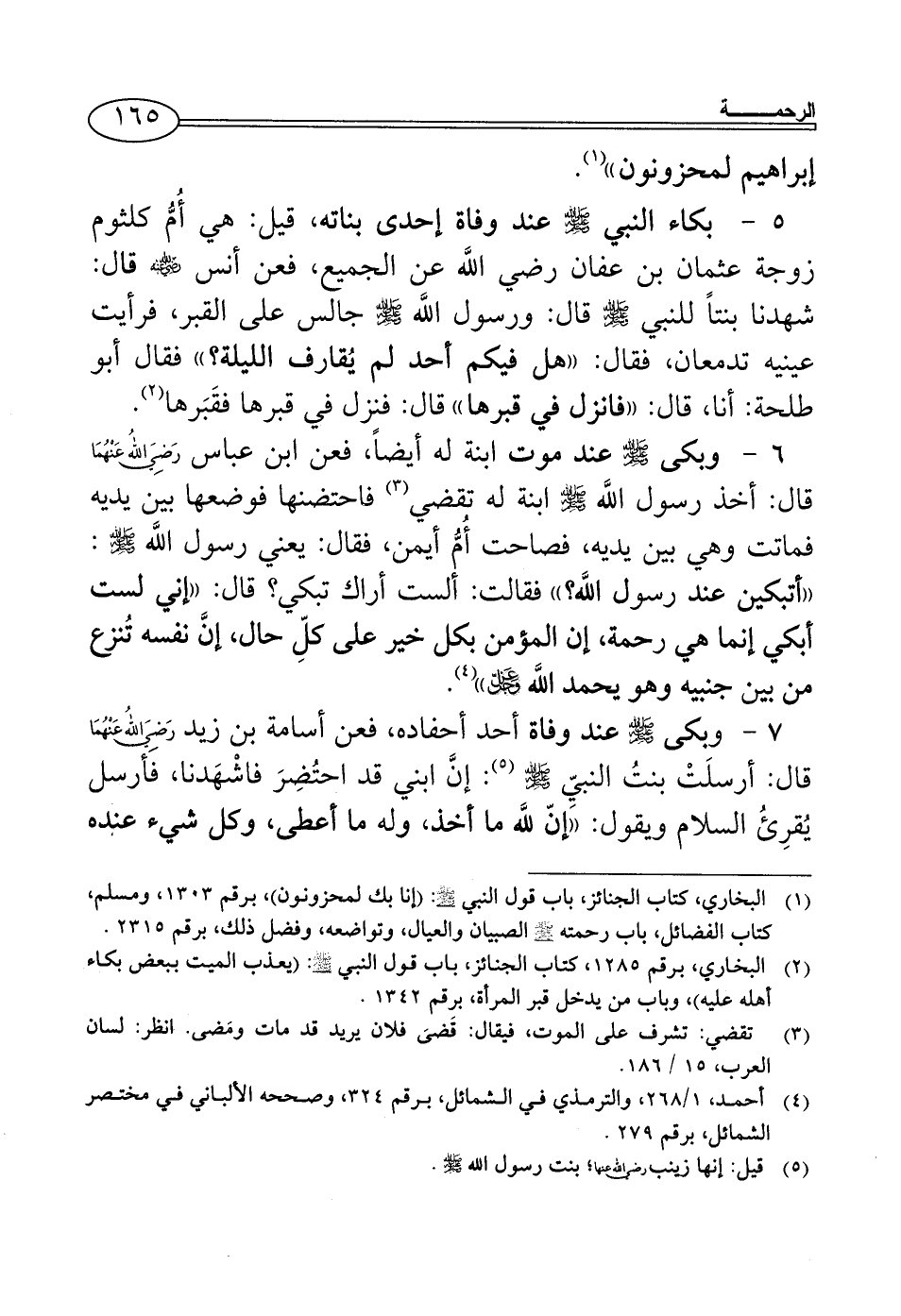 (¬1) البخاري، كتاب الجنائز، باب قول النبي - صلى الله عليه وسلم -: (إنا بك لمحزونون)، برقم 1303، ومسلم، كتاب الفضائل، باب رحمته - صلى الله عليه وسلم - الصبيان والعيال، وتواضعه، وفضل ذلك، برقم 2315.