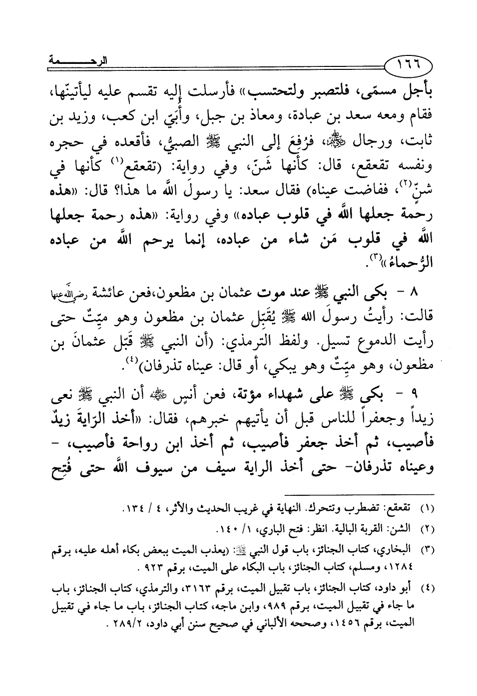 بأجل مسمّى، فلتصبر ولتحتسب» فأرسلت إليه تقسم عليه ليأتينّها، فقام ومعه سعد بن عبادة، ومعاذ بن جبل، وأُبَيّ ابن كعب، وزيد بن ثابت، ورجال - رضي الله عنهم -، فرُفِعَ إلى النبي - صلى الله عليه وسلم - الصبيُّ، فأقعده في حجره ونفسه تقعقع، قال: كأنها شَنّ، وفي رواية: (تقعقع (¬1) كأنها في شنٍّ (¬2)، ففاضت عيناه) فقال سعد: يا رسولَ اللَّه ما هذا؟ قال: «هذه رحمة جعلها اللَّه في قلوب عباده» وفي رواية: «هذه رحمة جعلها اللَّه في قلوب مَن شاء من عباده، إنما يرحم اللَّه من عباده الرُّحماءُ» (¬3).