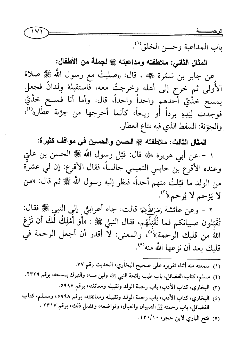 (¬4) البخاري، كتاب الأدب، باب رحمة الولد وتقبيله ومعانقته، برقم 5998، ومسلم، كتاب الفضائل، باب رحمته - صلى الله عليه وسلم - الصبيان والعيال، وتواضعه، وفضل ذلك، برقم 2317.