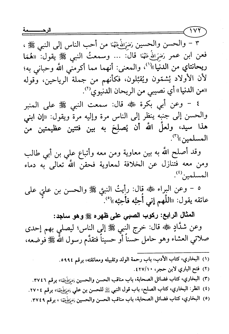 (¬5) البخاري، كتاب فضائل الصحابة، باب مناقب الحسن والحسين رَضِيَ اللهُ عَنْهُمَا، برقم 3749.