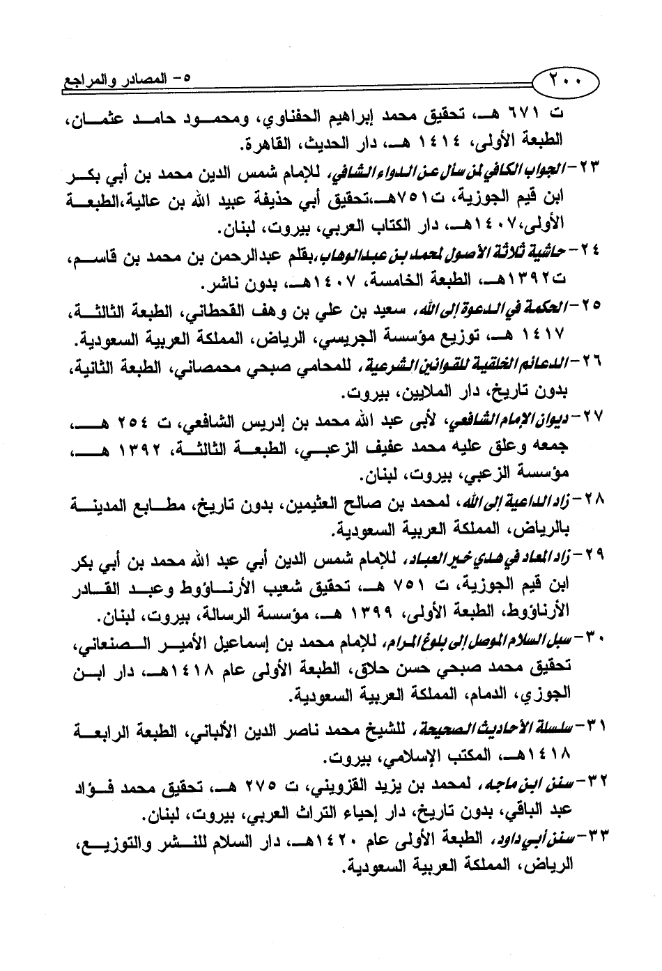 30 - سبل السلام الموصل إلى بلوغ المرام، للإمام محمد بن إسماعيل الأمير الصنعاني، تحقيق محمد صبحي حسن حلاق، الطبعة الأولى عام 1418هـ، دار ابن الجوزي، الدمام، المملكة العربية السعودية.
