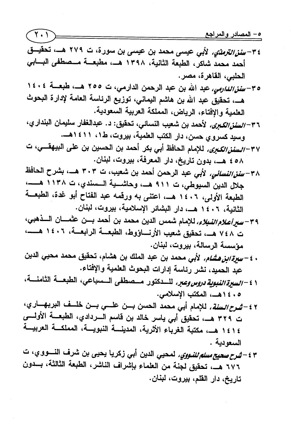 38 - سنن النسائي، لأبي عبد الرحمن أحمد بن شعيب، ت 303 هـ، بشرح الحافظ جلال الدين السيوطي، ت 911 هـ، وحاشية السندي، ت 1138 هـ، الطبعة الأولى، 1406 هـ، اعتنى به ورقمه عبد الفتاح أبو غدة، الطبعة الثانية، 1406 هـ، دار البشائر الإسلامية، بيروت، لبنان.