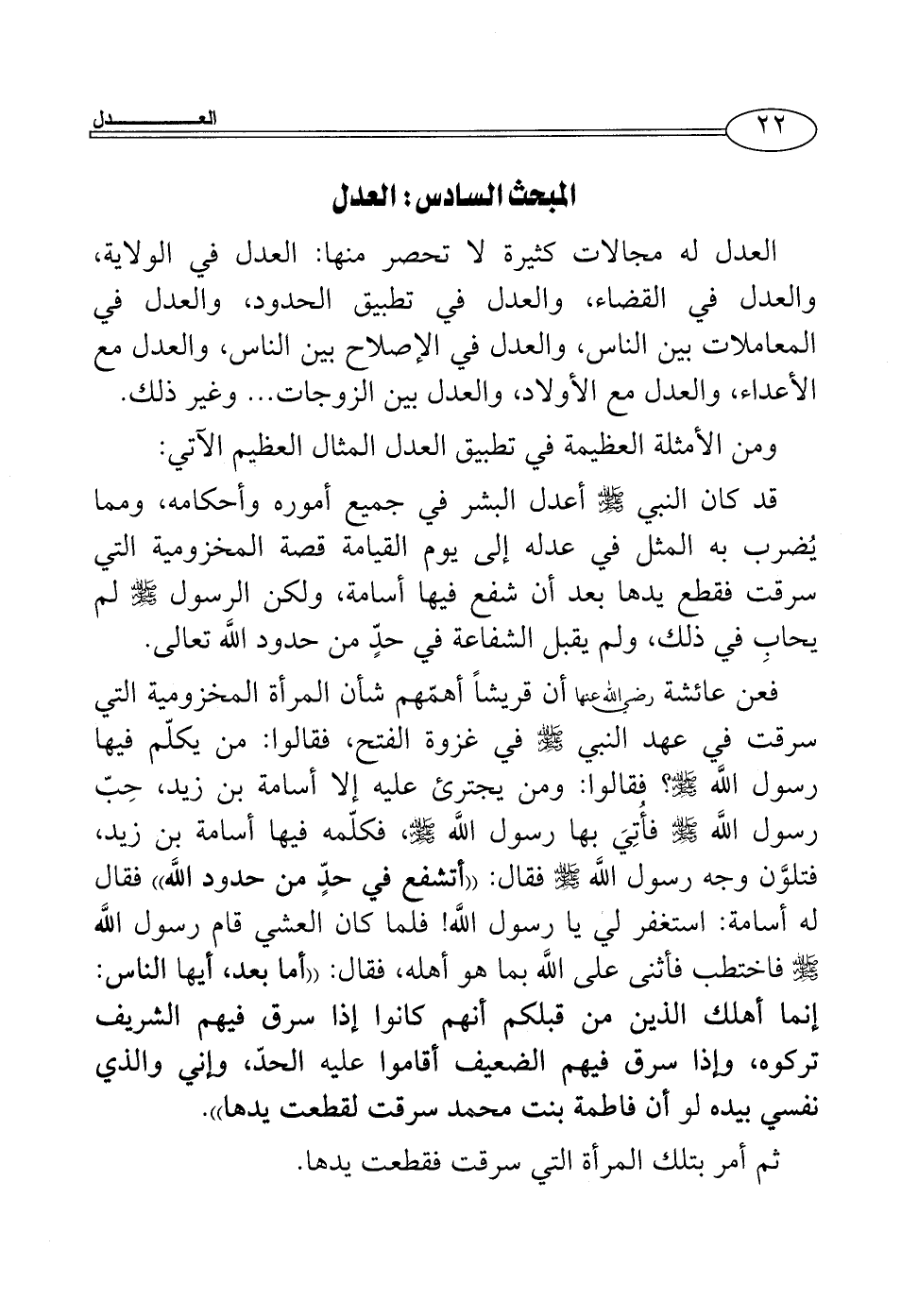 قد كان النبي - صلى الله عليه وسلم - أعدل البشر في جميع أموره وأحكامه، ومما يُضرب به المثل في عدله إلى يوم القيامة قصة المخزومية التي سرقت فقطع يدها بعد أن شفع فيها أسامة، ولكن الرسول - صلى الله عليه وسلم - لم يحابِ في ذلك، ولم يقبل الشفاعة في حدٍّ من حدود اللَّه تعالى.