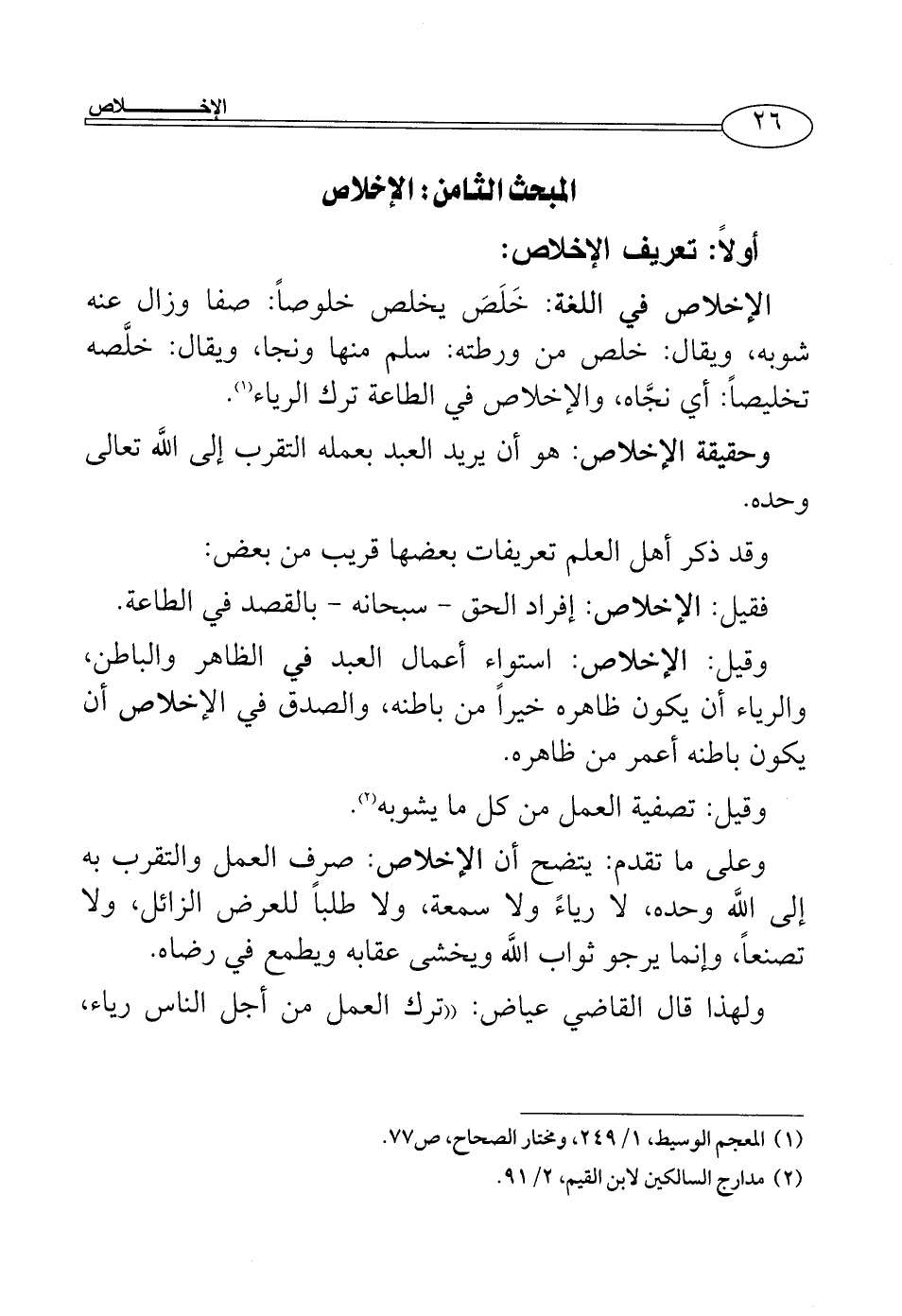وعلى ما تقدم: يتضح أن الإخلاص: صرف العمل والتقرب به إلى اللَّه وحده، لا رياءً ولا سمعة، ولا طلباً للعرض الزائل، ولا تصنعاً، وإنما يرجو ثواب اللَّه ويخشى عقابه ويطمع في رضاه.