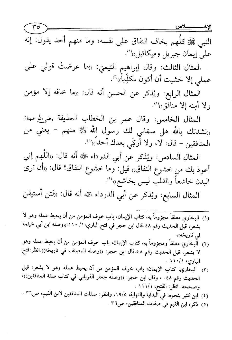 (¬3) البخاري، كتاب الإيمان، باب خوف المؤمن من أن يحبط عمله وهو لا يشعر، قبل الحديث رقم 48.، وقال ابن حجر: ((وصله جعفر الفريابي في كتاب صفة المنافقين))، وصححه. انظر: الفتح، 1/ 111.