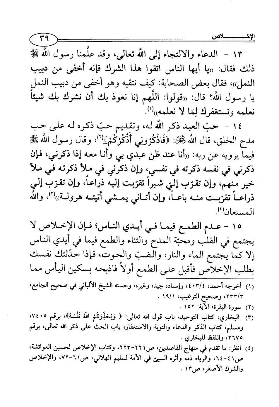 (¬4) انظر: ما تقدم في منهاج القاصدين، ص221 - 223، وكتاب الإخلاص لحسين العوائشة، ص41 - 64، والرياء ذمه وأثره السيئ في الأمة لسليم الهلالي، ص61 - 72، والإخلاص والشرك الأصغر، ص13.