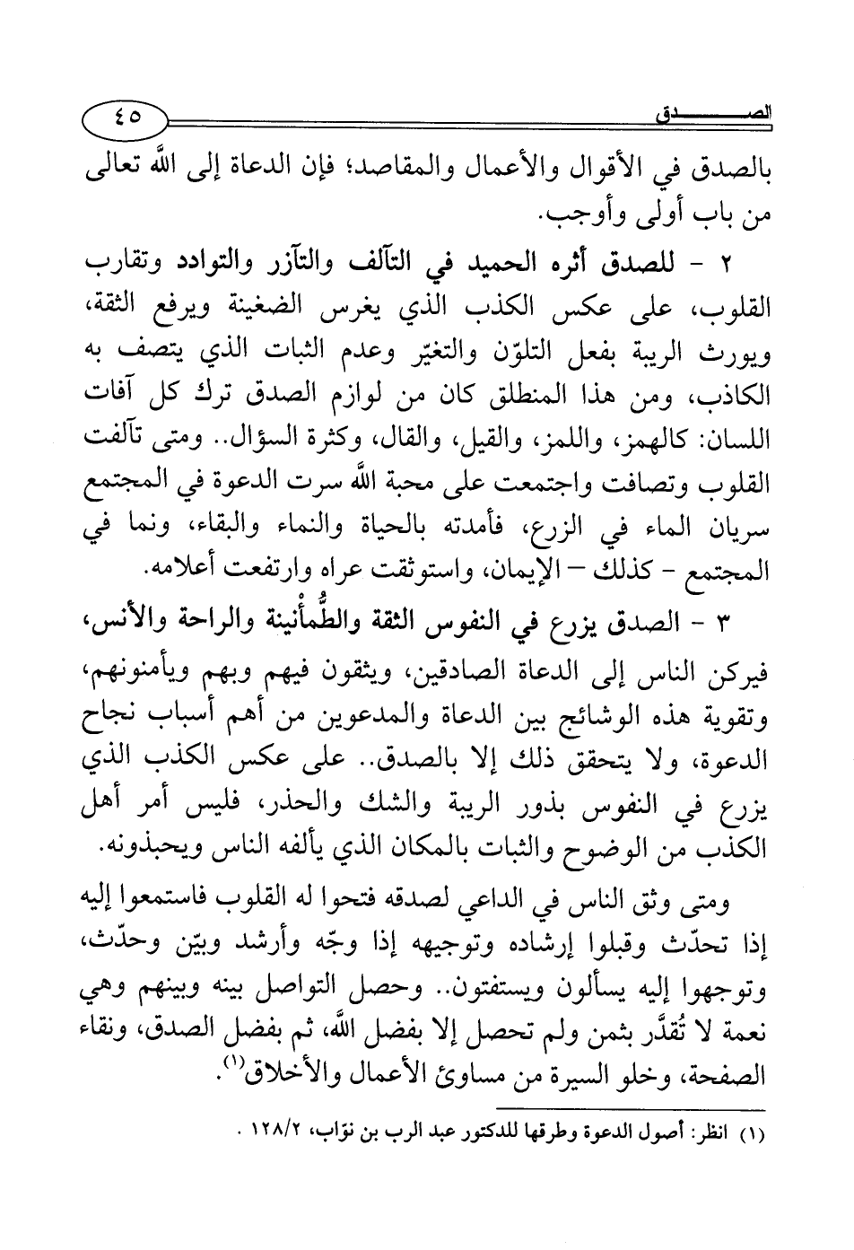 ومتى وثق الناس في الداعي لصدقه فتحوا له القلوب فاستمعوا إليه إذا تحدّث وقبلوا إرشاده وتوجيهه إذا وجّه وأرشد وبيّن وحدّث، وتوجهوا إليه يسألون ويستفتون .. وحصل التواصل بينه وبينهم وهي نعمة لا تُقدَّر بثمن ولم تحصل إلا بفضل اللَّه، ثم بفضل الصدق، ونقاء الصفحة، وخلو السيرة من مساوئ الأعمال والأخلاق (¬1).