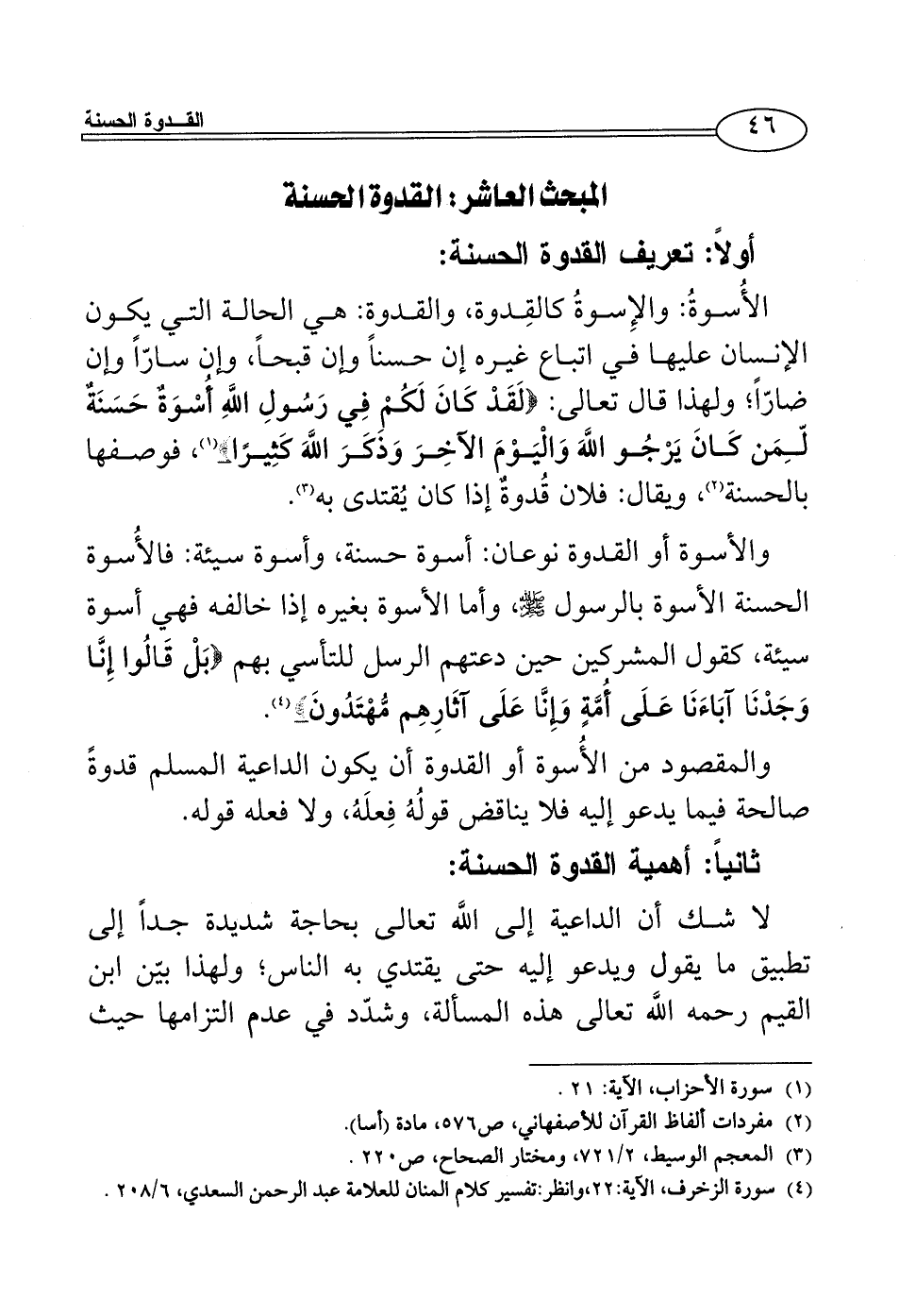 الأُسوةُ: والإِسوةُ كالقِدوة، والقدوة: هي الحالة التي يكون الإنسان عليها في اتباع غيره إن حسناً وإن قبحاً، وإن سارّاً وإن ضارّاً؛ ولهذا قال تعالى: {لَقَدْ كَانَ لَكُمْ فِي رَسُولِ اللَّهِ أُسْوَةٌ حَسَنَةٌ لِّمَن كَانَ يَرْجُو اللَّهَ وَالْيَوْمَ الآخِرَ وَذَكَرَ اللَّهَ كَثِيرًا} (¬1)، فوصفها بالحسنة (¬2)، ويقال: فلان قُدوةٌ إذا كان يُقتدى به (¬3).