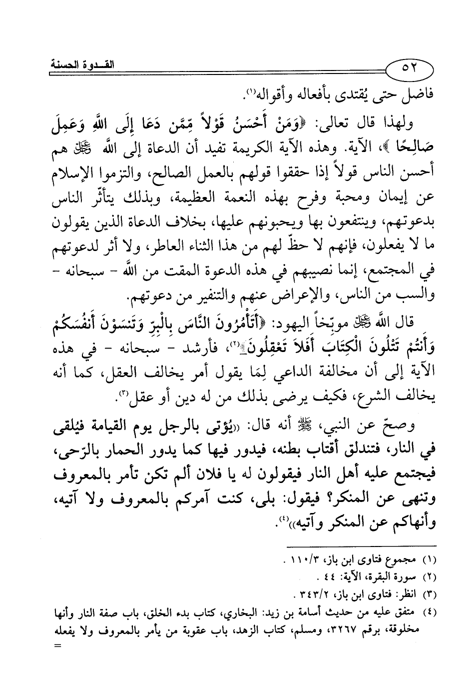 صَالِحًا}، الآية. وهذه الآية الكريمة تفيد أن الدعاة إلى اللَّه - عز وجل - هم أحسن الناس قولاً إذا حققوا قولهم بالعمل الصالح، والتزموا الإسلام عن إيمان ومحبة وفرح بهذه النعمة العظيمة، وبذلك يتأثّر الناس بدعوتهم، وينتفعون بها ويحبونهم عليها، بخلاف الدعاة الذين يقولون ما لا يفعلون، فإنهم لا حظّ لهم من هذا الثناء العاطر، ولا أثر لدعوتهم في المجتمع، إنما نصيبهم في هذه الدعوة المقت من اللَّه - سبحانه - والسب من الناس، والإعراض عنهم والتنفير من دعوتهم.