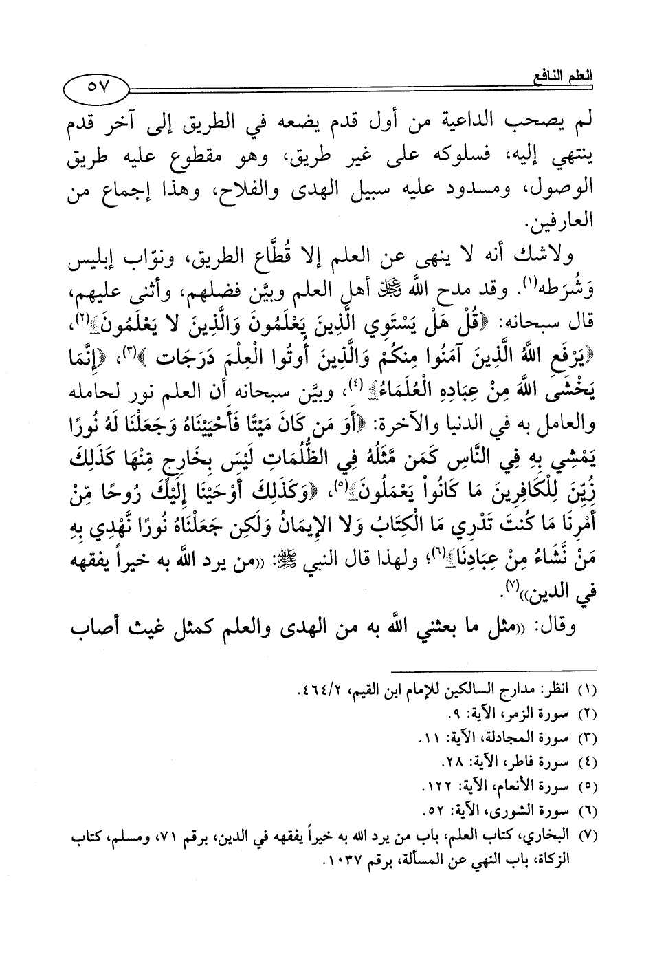 {يَرْفَعِ اللَّهُ الَّذِينَ آمَنُوا مِنكُمْ وَالَّذِينَ أُوتُوا الْعِلْمَ دَرَجَات} (¬3)، {إِنَّمَا يَخْشَى اللَّهَ مِنْ عِبَادِهِ الْعُلَمَاءُ} (¬4)، وبيَّن سبحانه أن العلم نور لحامله والعامل به في الدنيا والآخرة: {أَوَ مَن كَانَ مَيْتًا فَأَحْيَيْنَاهُ وَجَعَلْنَا لَهُ نُورًا يَمْشِي بِهِ فِي النَّاسِ كَمَن مَّثَلُهُ فِي الظُّلُمَاتِ لَيْسَ بِخَارِجٍ مِّنْهَا كَذَلِكَ زُيِّنَ لِلْكَافِرِينَ مَا كَانُواْ يَعْمَلُونَ} (¬5)، {وَكَذَلِكَ أَوْحَيْنَا إِلَيْكَ رُوحًا مِّنْ أَمْرِنَا مَا كُنتَ تَدْرِي مَا الْكِتَابُ وَلا الإِيمَانُ وَلَكِن جَعَلْنَاهُ نُورًا نَّهْدِي بِهِ مَنْ نَّشَاءُ مِنْ عِبَادِنَا} (¬6)؛ ولهذا قال النبي - صلى الله عليه وسلم -: ((من يرد اللَّه به خيراً يفقهه في الدين)) (¬7).