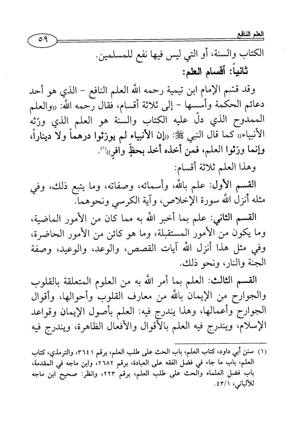 وقد قسّم الإمام ابن تيمية رحمه اللَّه العلم النافع - الذي هو أحد دعائم الحكمة وأسسها - إلى ثلاثة أقسام، فقال رحمه اللَّه: ((والعلم الممدوح الذي دلّ عليه الكتاب والسنة هو العلم الذي ورّثه الأنبياء)) كما قال النبي - صلى الله عليه وسلم -: ((إن الأنبياء لم يورّثوا درهماً ولا ديناراً، وإنما ورّثوا العلم، فمن أخذه أخذ بحظٍّ وافرٍ)) (¬1).
