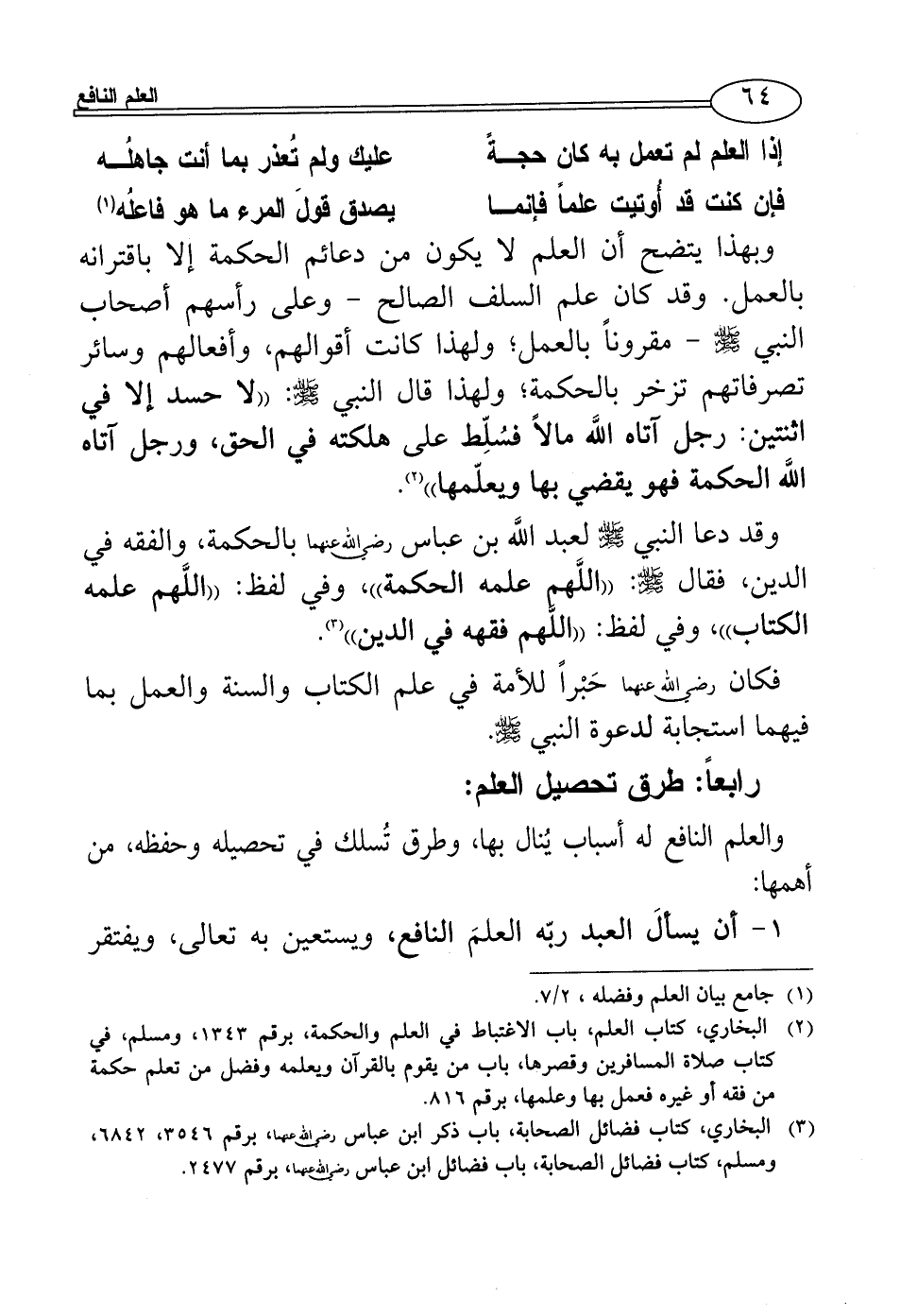 وبهذا يتضح أن العلم لا يكون من دعائم الحكمة إلا باقترانه بالعمل. وقد كان علم السلف الصالح - وعلى رأسهم أصحاب النبي - صلى الله عليه وسلم - مقروناً بالعمل؛ ولهذا كانت أقوالهم، وأفعالهم وسائر تصرفاتهم تزخر بالحكمة؛ ولهذا قال النبي - صلى الله عليه وسلم -: ((لا حسد إلا في اثنتين: رجل آتاه اللَّه مالاً فسُلِّط على هلكته في الحق، ورجل آتاه اللَّه الحكمة فهو يقضي بها ويعلّمها)) (¬2).