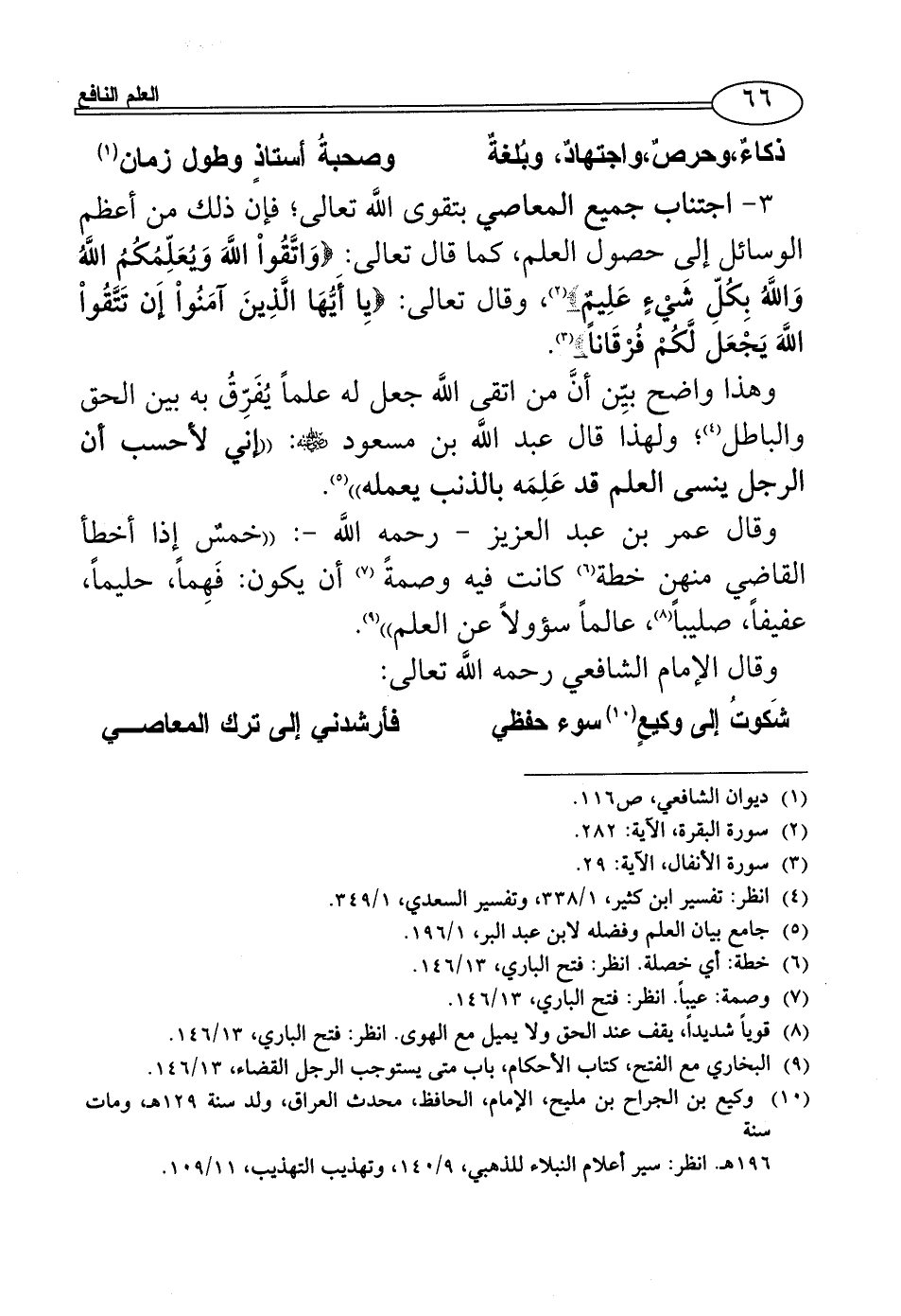 (¬10) ديوان الشافعي، ص88،وانظر: الجواب الكافي لمن سأل عن الدواء الشافي لابن القيم، ص104.