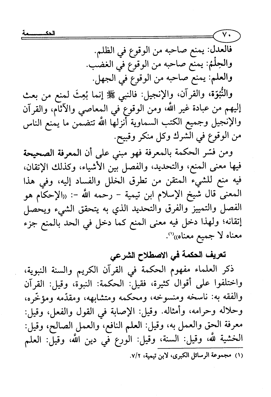ومن فسّر الحكمة بالمعرفة فهو مبني على أن المعرفة الصحيحة فيها معنى المنع، والتحديد، والفصل بين الأشياء، وكذلك الإتقان، فيه منع للشيء المتقن من تطرق الخلل والفساد إليه، وفي هذا المعنى قال شيخ الإسلام ابن تيمية - رحمه اللَّه -: ((الإحكام هو الفصل والتمييز والفرق والتحديد الذي به يتحقق الشيء ويحصل إتقانه؛ ولهذا دخل فيه معنى المنع كما دخل في الحد بالمنع جزء معناه لا جميع معناه)) (¬1).