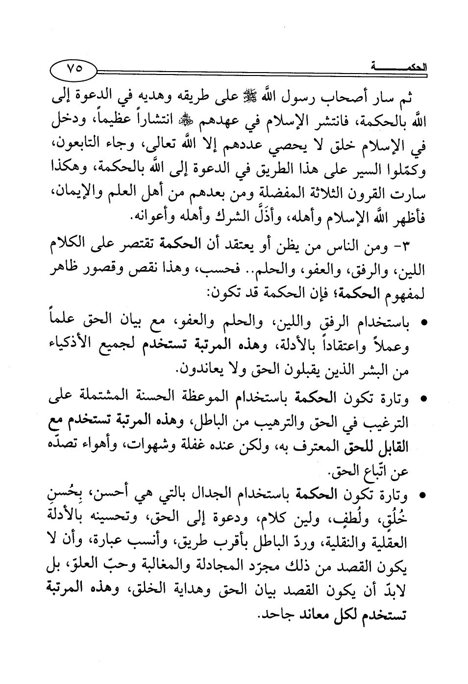- وتارة تكون الحكمة باستخدام الجدال بالتي هي أحسن، بِحُسنِ خُلُقٍ، ولُطفٍ، ولين كلام، ودعوة إلى الحق، وتحسينه بالأدلة العقلية والنقلية، وردّ الباطل بأقرب طريق، وأنسب عبارة، وأن لا يكون القصد من ذلك مجرّد المجادلة والمغالبة وحبّ العلوّ، بل لابدّ أن يكون القصد بيان الحق وهداية الخلق، وهذه المرتبة تستخدم لكل معاند جاحد.