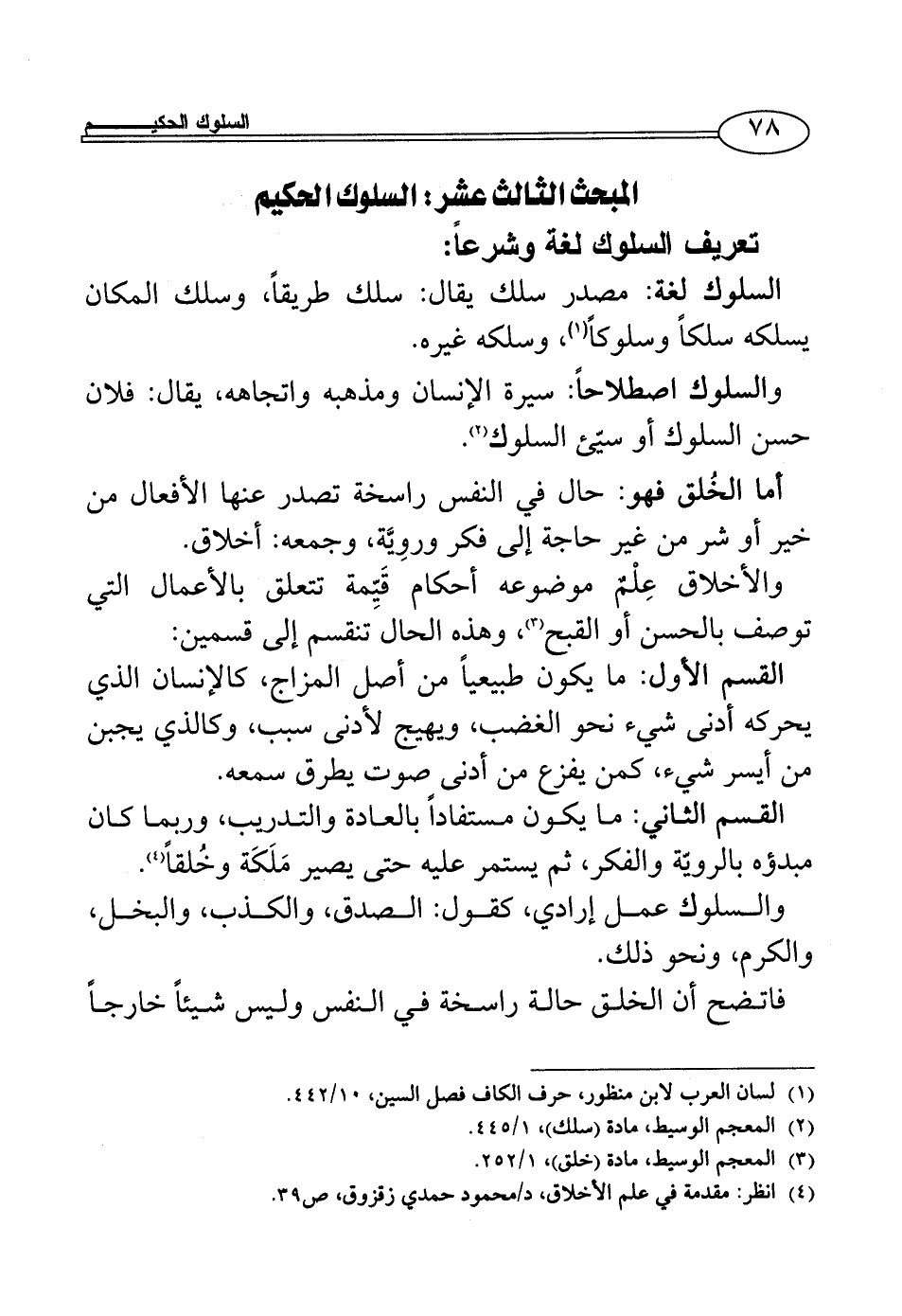 والسلوك عمل إرادي، كقول: الصدق، والكذب، والبخل، والكرم، ونحو ذلك.