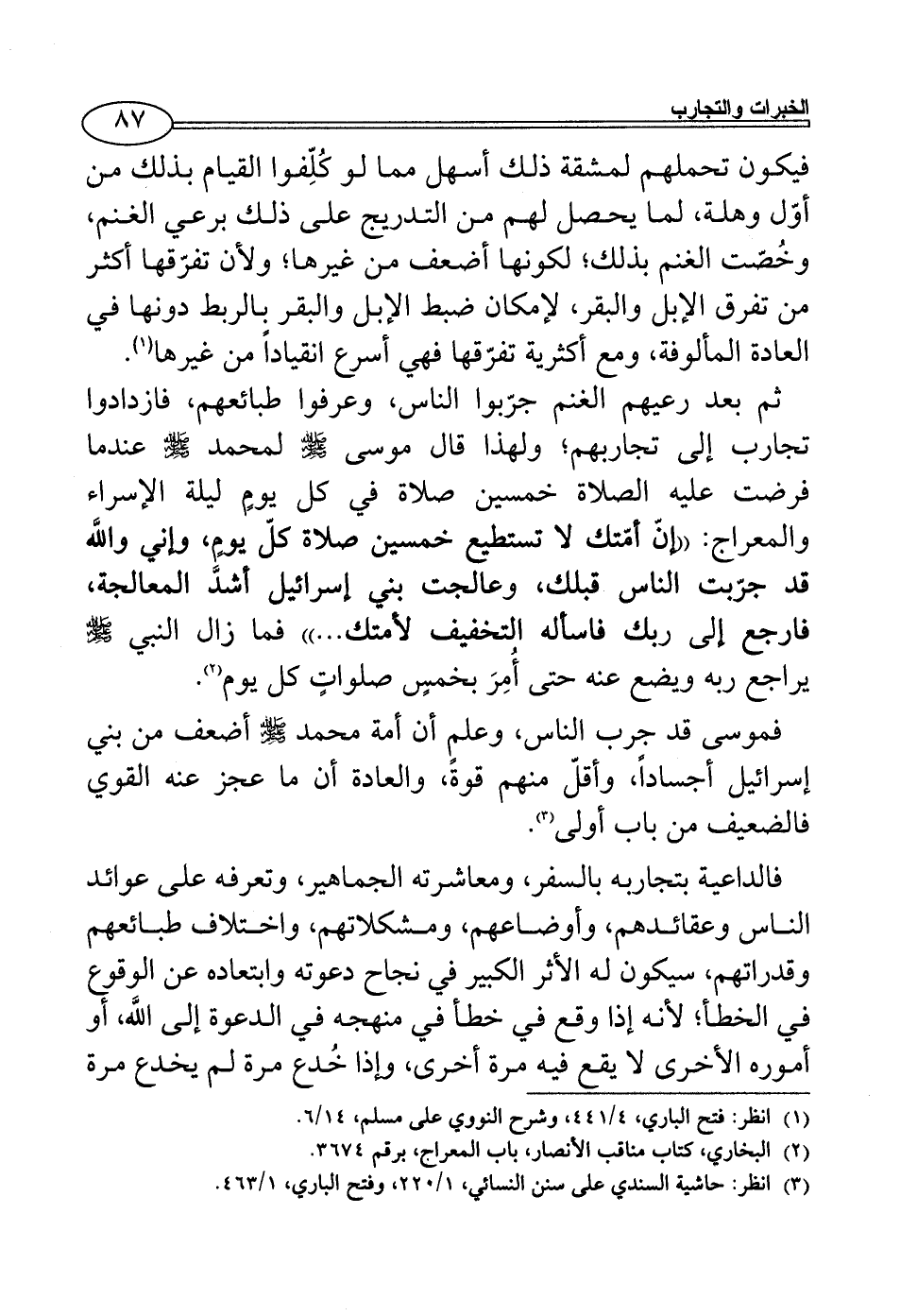 ثم بعد رعيهم الغنم جرّبوا الناس، وعرفوا طبائعهم، فازدادوا تجارب إلى تجاربهم؛ ولهذا قال موسى - صلى الله عليه وسلم - لمحمد - صلى الله عليه وسلم - عندما فرضت عليه الصلاة خمسين صلاة في كل يومٍ ليلة الإسراء والمعراج: ((إنّ أمّتك لا تستطيع خمسين صلاة كلّ يومٍ، وإني واللَّه قد جرّبت الناس قبلك، وعالجت بني إسرائيل أشدَّ المعالجة، فارجع إلى ربك فاسأله التخفيف لأمتك ... )) فما زال النبي - صلى الله عليه وسلم - يراجع ربه ويضع عنه حتى أُمِرَ بخمسٍ صلواتٍ كل يوم (¬2).