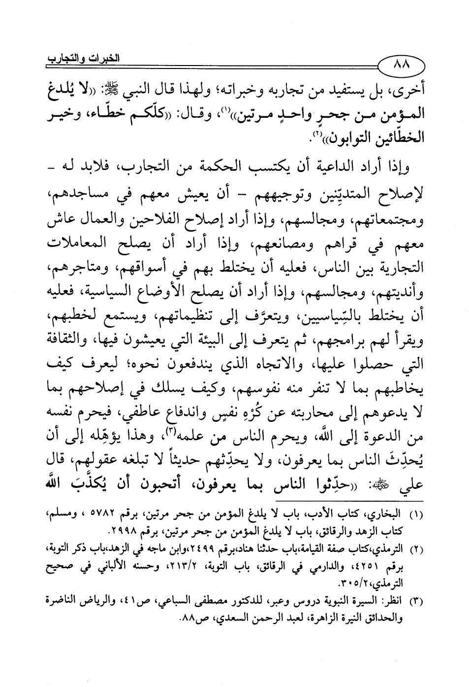 وإذا أراد الداعية أن يكتسب الحكمة من التجارب، فلابد له - لإصلاح المتديِّنين وتوجيههم - أن يعيش معهم في مساجدهم، ومجتمعاتهم، ومجالسهم، وإذا أراد إصلاح الفلاحين والعمال عاش معهم في قراهم ومصانعهم، وإذا أراد أن يصلح المعاملات التجارية بين الناس، فعليه أن يختلط بهم في أسواقهم، ومتاجرهم، وأنديتهم، ومجالسهم، وإذا أراد أن يصلح الأوضاع السياسية، فعليه أن يختلط بالسِّياسيين، ويتعرَّف إلى تنظيماتهم، ويستمع لخطبهم، ويقرأ لهم برامجهم، ثم يتعرف إلى البيئة التي يعيشون فيها، والثقافة التي حصلوا عليها، والاتجاه الذي يندفعون نحوه؛ ليعرف كيف يخاطبهم بما لا تنفر منه نفوسهم، وكيف يسلك في إصلاحهم بما لا يدعوهم إلى محاربته عن كُرْهِ نفسٍ واندفاع عاطفي، فيحرم نفسه من الدعوة إلى اللَّه، ويحرم الناس من علمه (¬3)، وهذا يؤهِّله إلى أن يُحدِّثَ الناس بما يعرفون، ولا يحدِّثهم حديثاً لا تبلغه عقولهم، قال علي - رضي الله عنه -: ((حدِّثوا الناس بما يعرفون، أتحبون أن يُكذَّبَ اللَّه