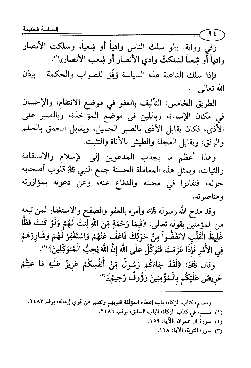 الطريق الخامس: التأليف بالعفو في موضع الانتقام، والإحسان في مكان الإساءة، وباللين في موضع المؤاخذة، وبالصبر على الأذى، فكان يقابل الأذى بالصبر الجميل، ويقابل الحمق بالحلم والرفق، ويقابل العجلة والطيش بالأناة والتثبت.
