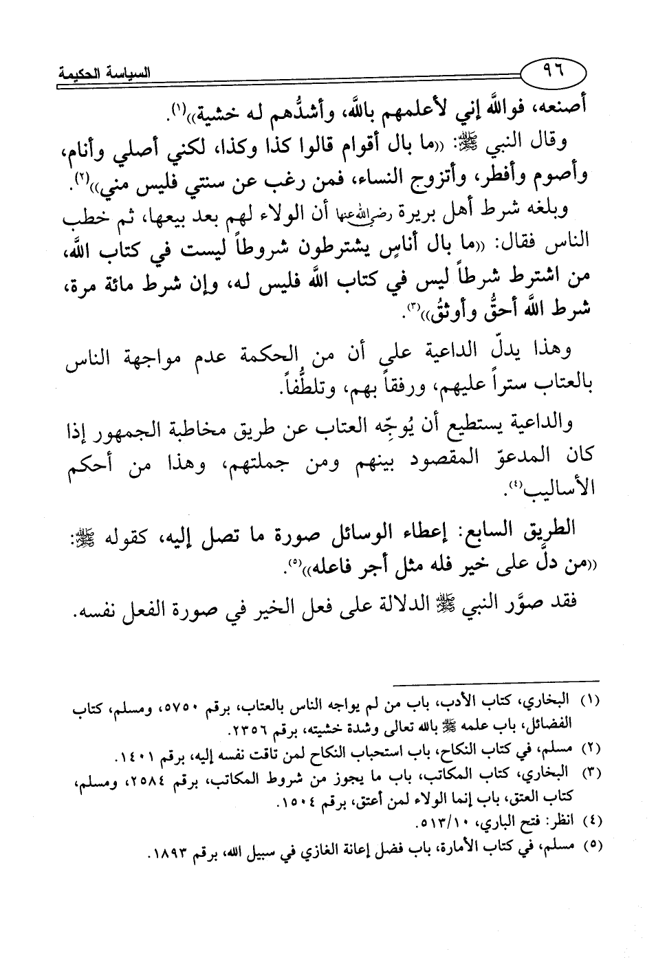 وبلغه شرط أهل بريرة رضي الله عنها أن الولاء لهم بعد بيعها، ثم خطب الناس فقال: ((ما بال أناسٍ يشترطون شروطاً ليست في كتاب اللَّه، من اشترط شرطاً ليس في كتاب اللَّه فليس له، وإن شرط مائة مرة، شرط اللَّه أحقُّ وأوثقُ)) (¬3).