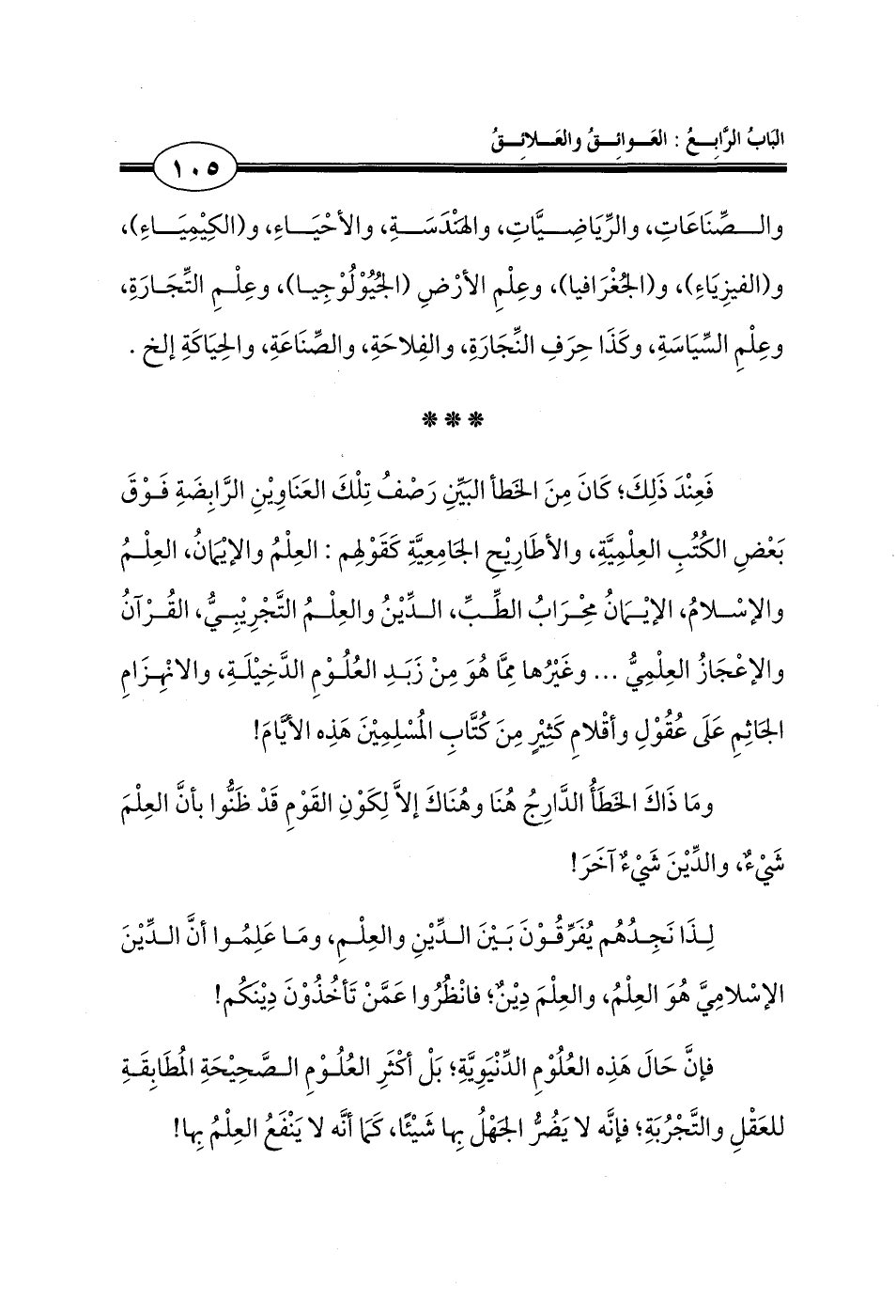ومَا ذَاكَ الخَطَأُ الدَّارِجُ هُنَا وهُنَاكَ إلَّا لِكَوْنِ القَوْمِ قَدْ ظَنُّوا بأنَّ العِلْمَ شَيءٌ، والدِّينَ شَيء آخَرَ!