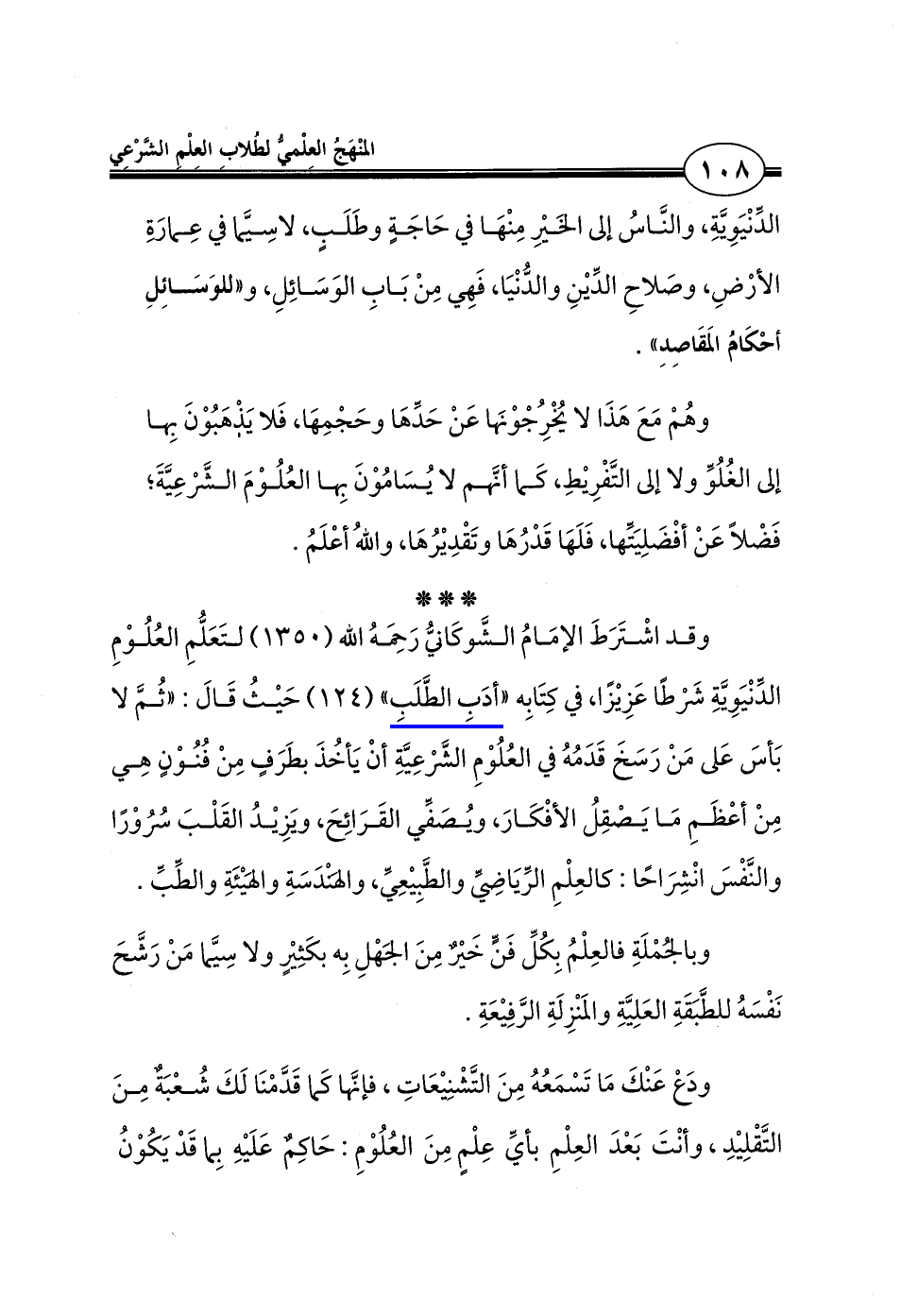 وقد اشْتَرَطَ الإمَامُ الشَّوكَانيُّ رَحِمَهُ الله (1350) لتَعَلُّمِ العُلُوْمِ الدِّنْيَوِيَّةِ شَرْطًا عَزِيرًا، في كِتَابِه "أدَبِ الطَّلَبِ" (124) حَيثُ قَالَ: "ثُمَّ لا بَأسَ عَلى مَنْ رَسَخَ قَدَمُهُ في العُلُوْمِ الشَّرْعِيَّةِ أنْ يَأخُذَ بطَرَفٍ مِنْ فُنُوْن هِي مِنْ أعْظَمِ مَا يَصْقِلُ الأفْكَارَ، ويُصَفِّي القَرَائِحَ، ويَزِيدُ القَلْبَ سُرُوْرًا والنَّفْسَ انْشِرَاحًا: كالعِلْمِ الرِّيَاضِيِّ والطَّبِيعِيِّ، والهندَسَةِ والهَيئَةِ والطِّبِّ.