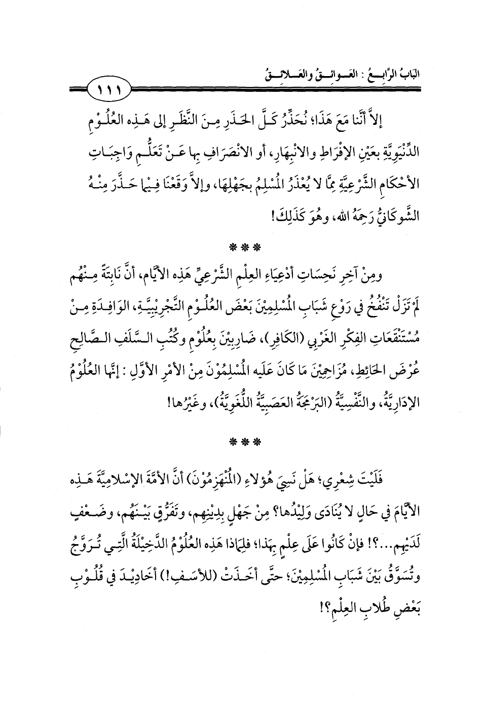 إلَّا أنَّنا مَعَ هَذَا؛ نُحَذِّرُ كَلَّ الحَذَرِ مِنَ النَّظَرِ إلى هَذِه العُلُوْمِ الدِّنْيَوِيَّةِ بعَينِ الإفْرَاطِ والانْبِهَارِ، أو الانْصَرَافِ بِها عَنْ تَعَلُّمِ وَاجِبَاتِ الأحْكَامِ الشَّرْعِيَّةِ مِمَّا لا يُعْذَرُ المُسْلِمُ بجَهْلِهَا، وإلَّا وَقَعْنَا فِيما حَذَّرَ مِنْهُ الشَّوكَانيُّ رَحِمَهُ الله، وهُوَ كَذَلِكَ!