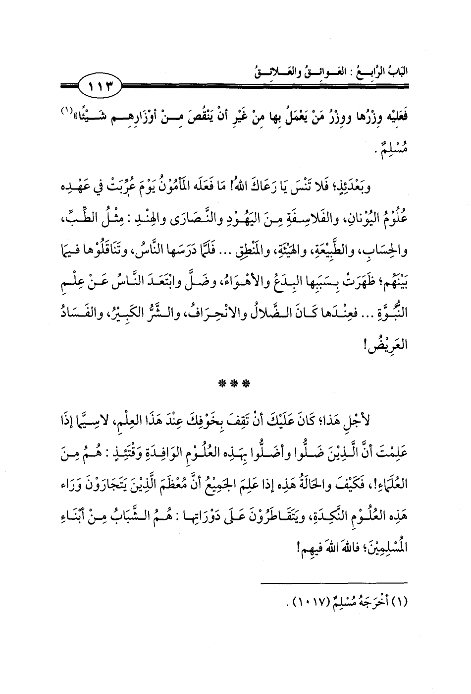 وبَعْدَئِذٍ؛ فَلا تَنْسَ يَا رَعَاكَ اللهُ! مَا فَعَلَه المأمُوْنُ يَوْمَ عرِّبَتْ في عَهْدِه عُلُوْمُ اليُوْنانِ، والفَلاسِفَةِ مِنَ اليَهُوْدِ والنَّصَارَى والِهنْدِ: مِثْلُ الطِّبِّ، والحِسَابِ، والطَّبِيعَةِ، والهَيئَةِ، والمَنْطِقِ ... فَلَمّا دَرَسَها النَّاسُ، وتَنَاقَلُوْها فيمَا بَينَهُم؛ ظَهَرَتْ بِسَبَبِها البِدَعُ والأهْوَاءُ، وضَلَّ وابْتَعَدَ النَّاسُ عَنْ عِلْمِ النُّبوَّةِ ... فعِنْدَها كَانَ الضَّلالُ والانْحِرَافُ، والشَّرُّ الكَبِيرُ، والفَسَادُ العَرِيضُ!