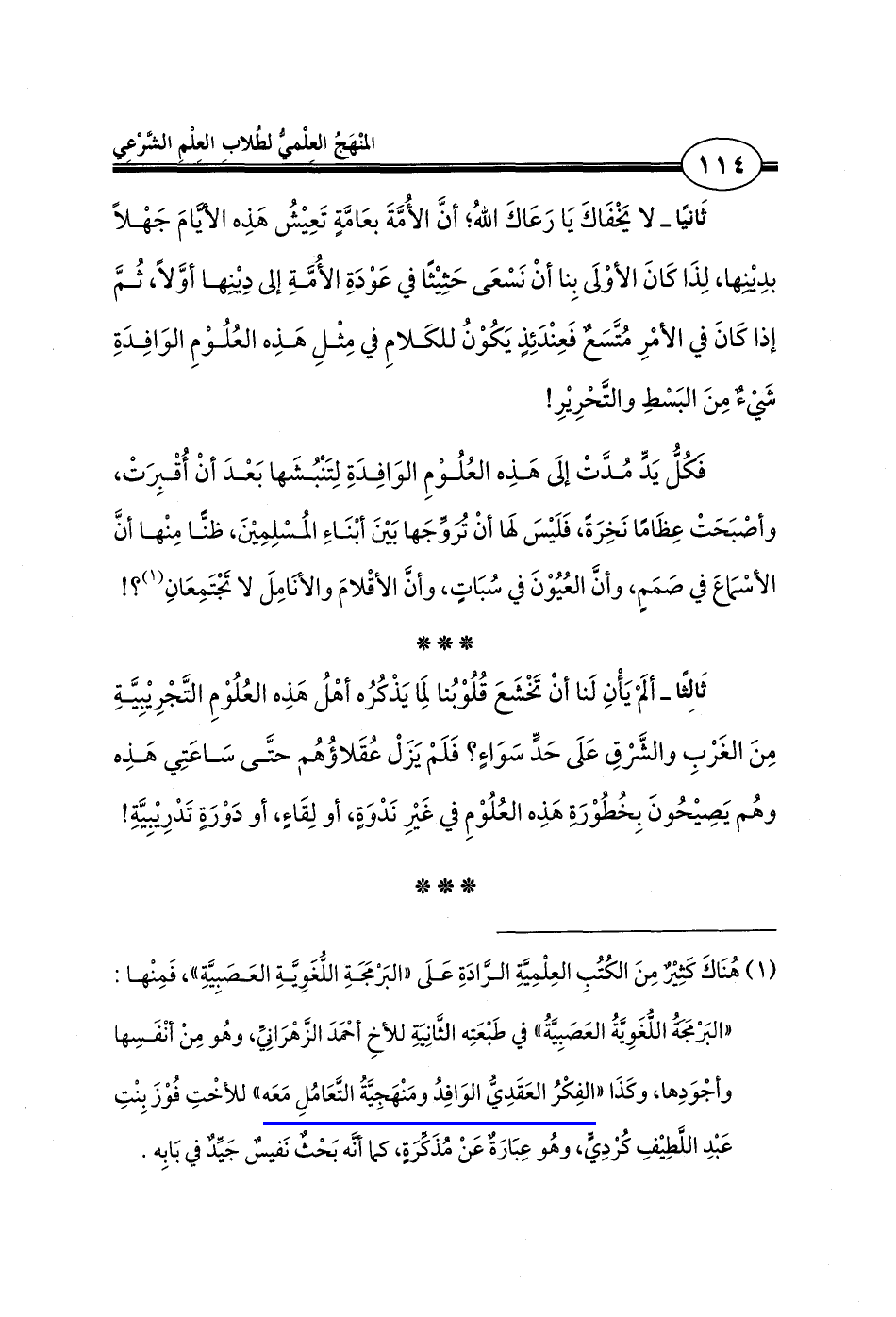 ثَانيًا - لا يَخْفَاكَ يَا رَعَاكَ اللهُ؛ أنَّ الأُمَّةَ بعَامَّة تَعِيشُ هَذِه الأيامَ جَهْلًا بدِينها، لِذَا كَانَ الأوْلَى بِنا أنْ نَسْعَى حَثِيثًا في عَوْدَةِ الأُمَّةِ إلى دِينها أوَّلًا، ثُمَّ إذا كَانَ في الأمْرِ مُتَّسَعٌ فَعِنْدَئِذٍ يَكُوْنُ للكَلامِ في مِثْلِ هَذِه العُلُوْمِ الوَافِدَةِ شَيءٌ مِنَ البَسْطِ والتَّحْرِيرِ!