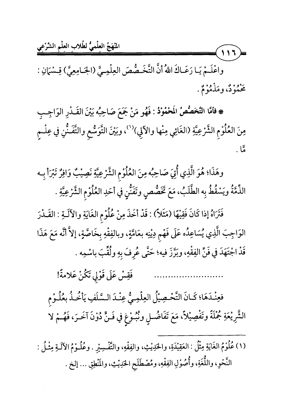 واعْلَمْ يَا رَعَاكَ اللهُ أنَّ التَّخَصُّصَ العِلْمِيَّ (الجَامِعِيَّ) قِسْمَانِ: مَحْمُوْدٌ، ومَذْمُوْمٌ.