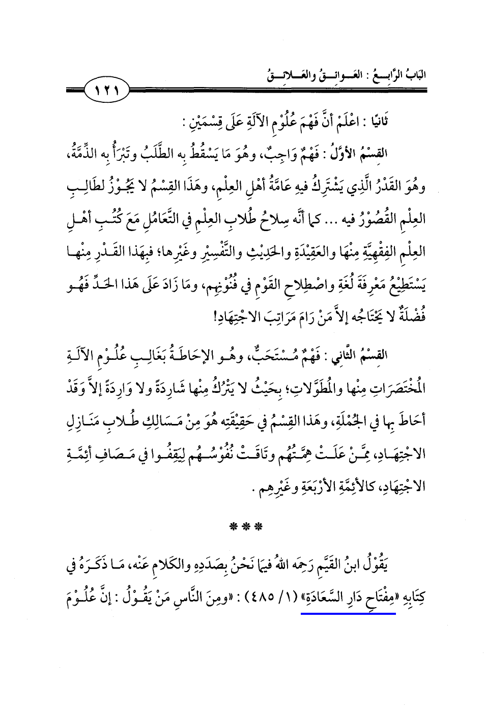 يَقُوْلُ ابنُ القَيَّمِ رَحِمَه اللهُ فيمَا نَحْنُ بِصَدَدِهِ والكَلامِ عَنْه، مَا ذَكَرَهُ في كِتَابِهِ "مِفْتَاحِ دَارِ السَّعَادَةِ" (1/ 485): "ومِنَ النَّاسِ مَنْ يَقُوْلُ: إنَّ عُلُوْمَ