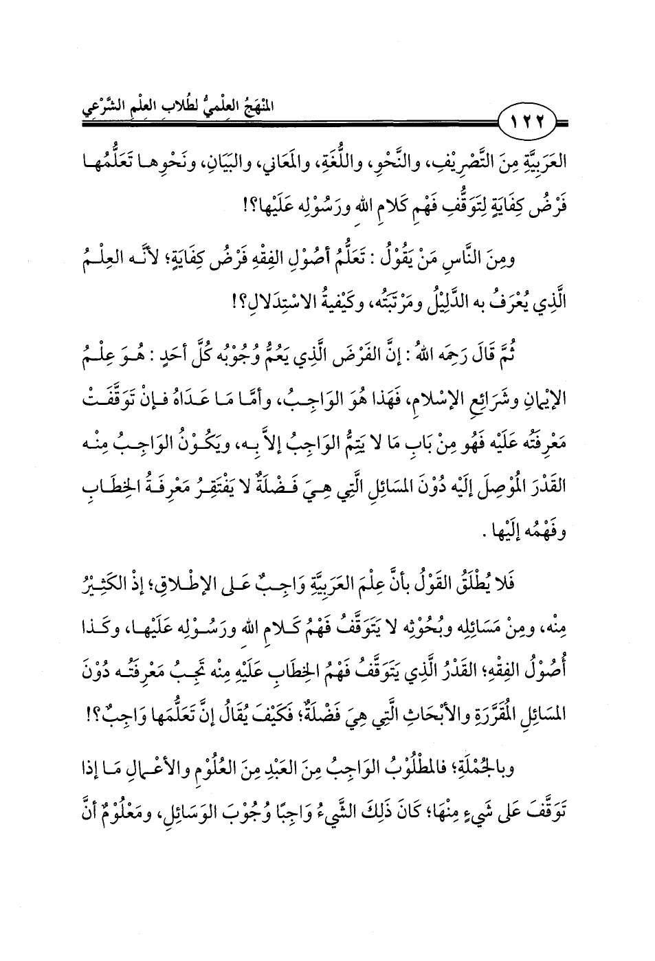 فَلا يُطْلَقُ القَوْلُ بأنَّ عِلْمَ العَرَبِيَّةِ وَاجِبٌ عَلى الإطْلاقِ؛ إذْ الكَثِيرُ مِنْه، ومِنْ مَسَائِلِه وبُحُوْثِه لا يَتَوَقَّفُ فَهْمُ كَلامِ اللهِ ورَسُوْلِه عَلَيها، وكَذا أُصُوْلُ الفِقْهِ؛ القَدْرُ الَّذِي يَتَوَقَّفُ فَهْمُ الخِطَابِ عَلَيهِ مِنْه تَجِبُ مَعْرِفَتُه دُوْنَ المسَائِلِ المُقَرَّر والأبْحَاثِ الَّتِي هِيَ فَضْلَةٌ؛ فَكَيفَ يُقَالُ إنَّ تَعَلُّمَها وَاجِبٌ؟!
