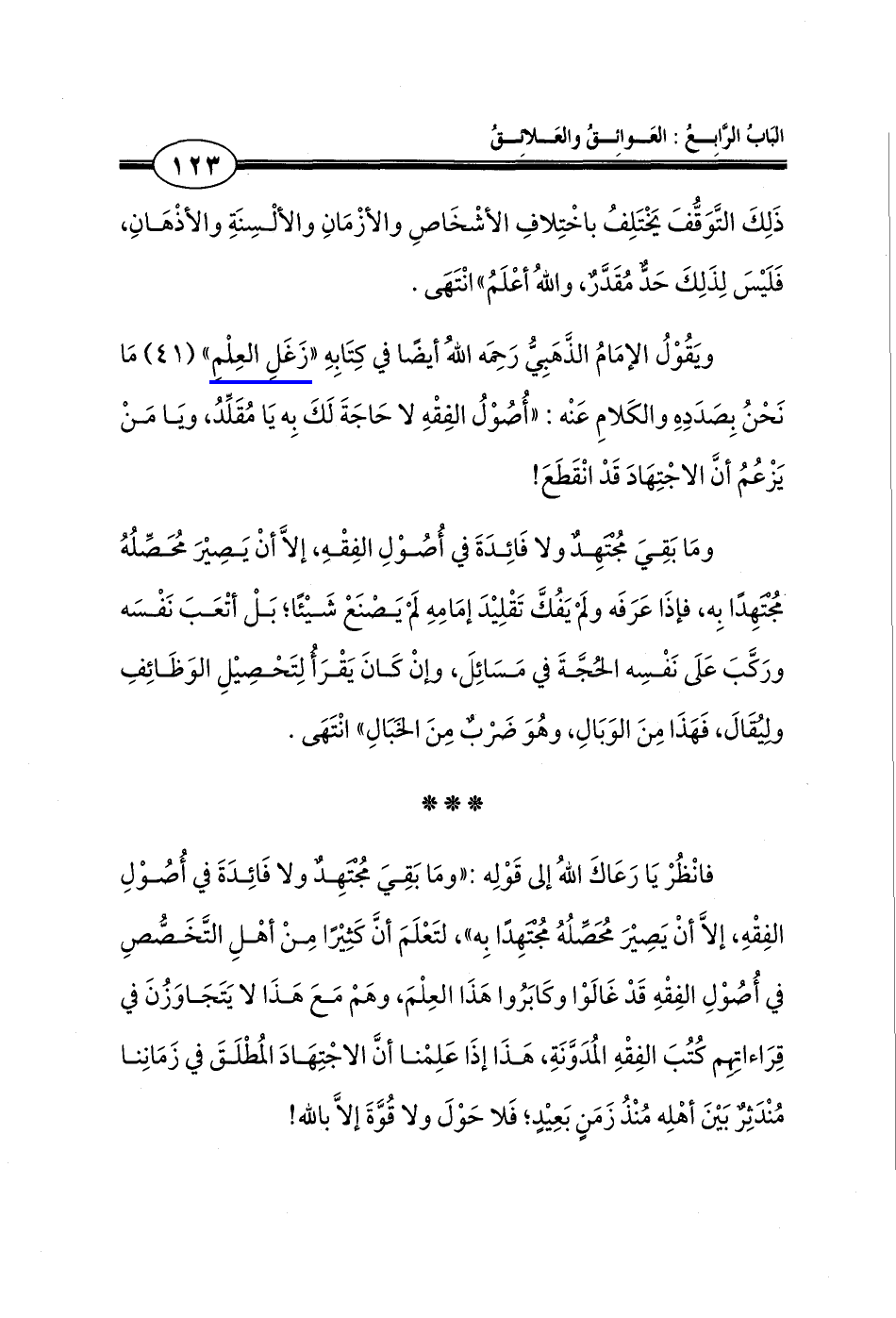 ويَقُوْلُ الإمَامُ الذَّهَبِيُّ رَحِمَه اللهُ أيضًا في كِتَابِهِ "زَغَلِ العِلْمِ" (41) مَا نَحْنُ بِصَدَدِهِ والكَلامِ عَنْه: "أُصُوْلُ الفِقْهِ لا حَاجَةَ لَكَ بِه يَا مُقَلِّدُ، ويَا مَنْ يَزْعُمُ أنَّ الاجْتِهَادَ قَدْ انْقَطَعَ!