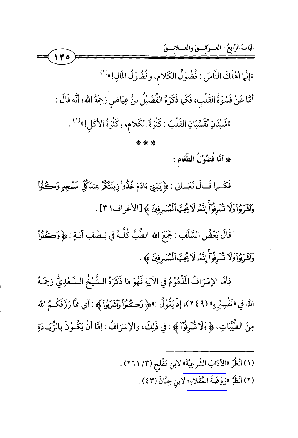 فكَما قَالَ تَعَالى: {يَابَنِي آدَمَ خُذُوا زِينَتَكُمْ عِنْدَ كُلِّ مَسْجِدٍ وَكُلُوا وَاشْرَبُوا وَلَا تُسْرِفُوا إِنَّهُ لَا يُحِبُّ الْمُسْرِفِينَ} [الأعراف: 31].