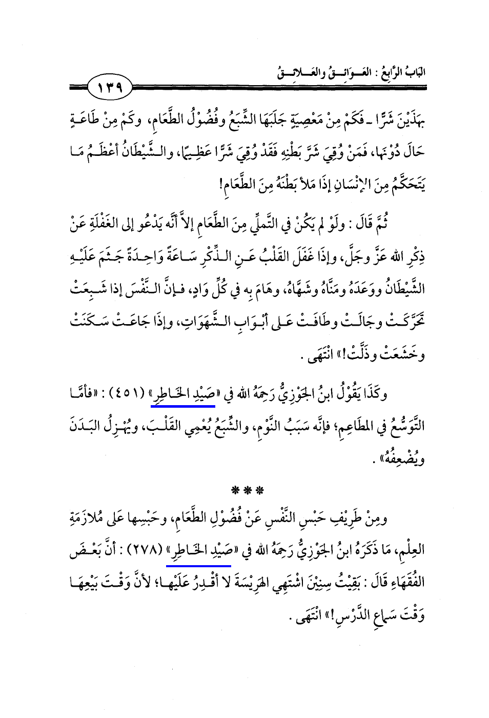 وكَذَا يَقُوْلُ ابنُ الجَوْزِيُّ رَحِمَهُ الله في "صَيدِ الخَاطِرِ" (451): "فأمَّا التَّوَسُّع في المطَاعِمِ؛ فإنَّه سَبَبُ النَّوْمِ، والشِّبَعُ يُعْمِي القَلْبَ، ويُهْزِلُ البَدَنَ ويُضْعِفُهُ".