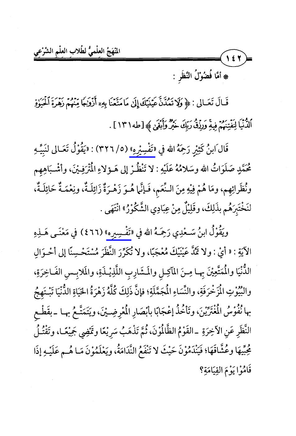 ويَقُوْلُ ابنُ سَعْدِي رَحِمَهُ الله في "تَفْسِيرِه" (466) في مَعْنَى هَذِهِ الآيةِ: "أي: ولا تَمُدَّ عَينيكَ مُعْجَبًا، ولا تكرِّرَ النَّظَرَ مُسْتَحْسِنًا إلى أحْوَالِ الدُّنْيَا والمُمَتَّعِينَ بِها مِنَ المآكِلِ والمَشَارِبِ اللَّذِيذَةِ، والمَلابِسِ الفَاخِرَةِ، والبُيُوْتِ الُمزخْرَفَةِ، والنِّسَاءِ المُجَمَّلَةِ؛ فإنَّ ذَلِكَ كُلَّهُ زَهْرَةُ الحَيَاةِ الدُّنْيَا تَبْتَهِجُ بها نُفُوْسُ المُغْتَرِّينَ، وتَأخُذُ إعْجَابًا بأبْصَارِ المُعْرِضِينَ، ويَتَمَتَّعُ بها -بقَطْعِ النَّظَرِ عَنِ الآخِرَةِ- القَوْمُ الظَّالمُوْنَ، ثُمَّ تَذْهَبُ سَرِيعًا وتَمْضِي جَمِيعًا، وتَقْتُلُ مُحِبِّيهَا وعُشَّاقَهَا؛ فَيَنْدَمُوْنَ حَيثَ لا تَنْفَعُ النَّدَامَةُ، ويَعْلَمُوْنَ مَا هُم عَلَيهِ إذَا قَامُوْا يَوْمَ القِيَامَةِ؟
