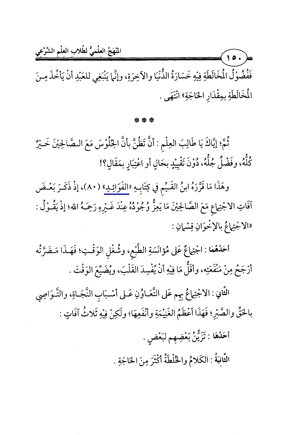 وهَذَا مَا قَرَّرَهُ ابنُ القَيِّمِ في كِتَابِهِ "الفَوَائِدِ" (80)، إذْ ذَكَرَ بَعْضَ آفَاتِ الاجْتِماعِ مَعَ الصَّالحِينَ مَا يَعِزُّ وُجُوْدُهُ عِنْدَ غَيرِهِ رَحِمَهُ الله؛ إذْ يَقُوْلُ: "الاجْتِماعُ بالإخْوَانِ قِسْمانِ: