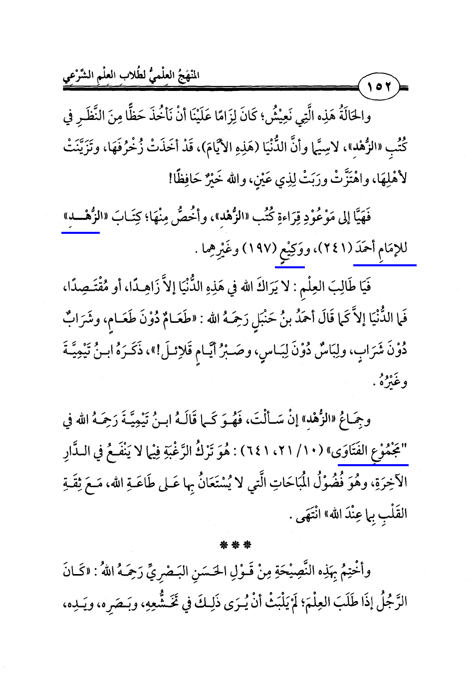 فَيَا طَالِبَ العِلْمِ: لا يَرَاكَ الله في هَذ الدُّنْيَا إلا زَاهِدًا، أو مُقْتَصِدًا، فَما الدُّنْيَا إلَّا كَما قَالَ أحمَدُ بنُ حَنْبَلٍ رَحِمَهُ الله: "طَعَامٌ دُوْنَ طَعَامٍ، وشَرَابٌ دُوْنَ شرَابٍ، ولِبَاسٌ دُوْنَ لِبَاسٍ، وصَبْرُ أيامٍ قَلاِئلَ! "، ذَكَرَه ابنُ تَيمِيَّةَ وغَيرُه.