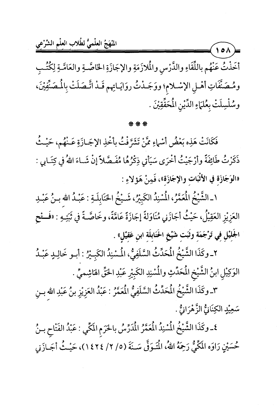 1 - الشَّيخُ المُعَمَّرُ، المُسْنِدُ الكَبِيرُ، شَيخُ الحَنَابِلَةِ: عَبْدُ اللهِ بنُ عَبْدِ العَزِيزِ العَقِيلُ، حَيثُ أجَازَني مُنَاوَلةً إجَازَةً عَامَّة، وخَاصَّة في ثَبَتِه: "فَتْحِ الجَلِيلِ فِي تَرْجَمَةِ وثَبَتِ شَيخ الحنابِلَةِ ابنِ عَقِيلٍ".