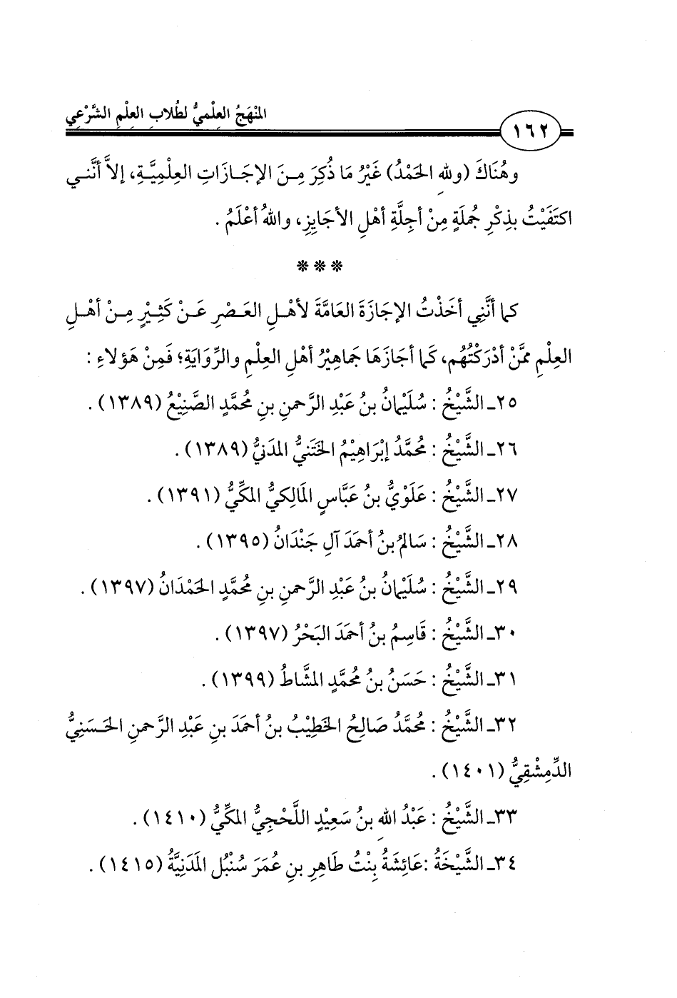 كما أنَّنِي أخَذْتُ الإجَازة العَامَّةَ لأهْلِ العَصْرِ عَنْ كَثِيرٍ مِنْ أهْلِ العِلْمِ ممَّنْ أدْرَكْتُهُم، كَما أجَازَهَا جَماهِيرُ أهْلِ العِلْمِ والرِّوَايَةِ؛ فَمِنْ هَؤلاءِ: