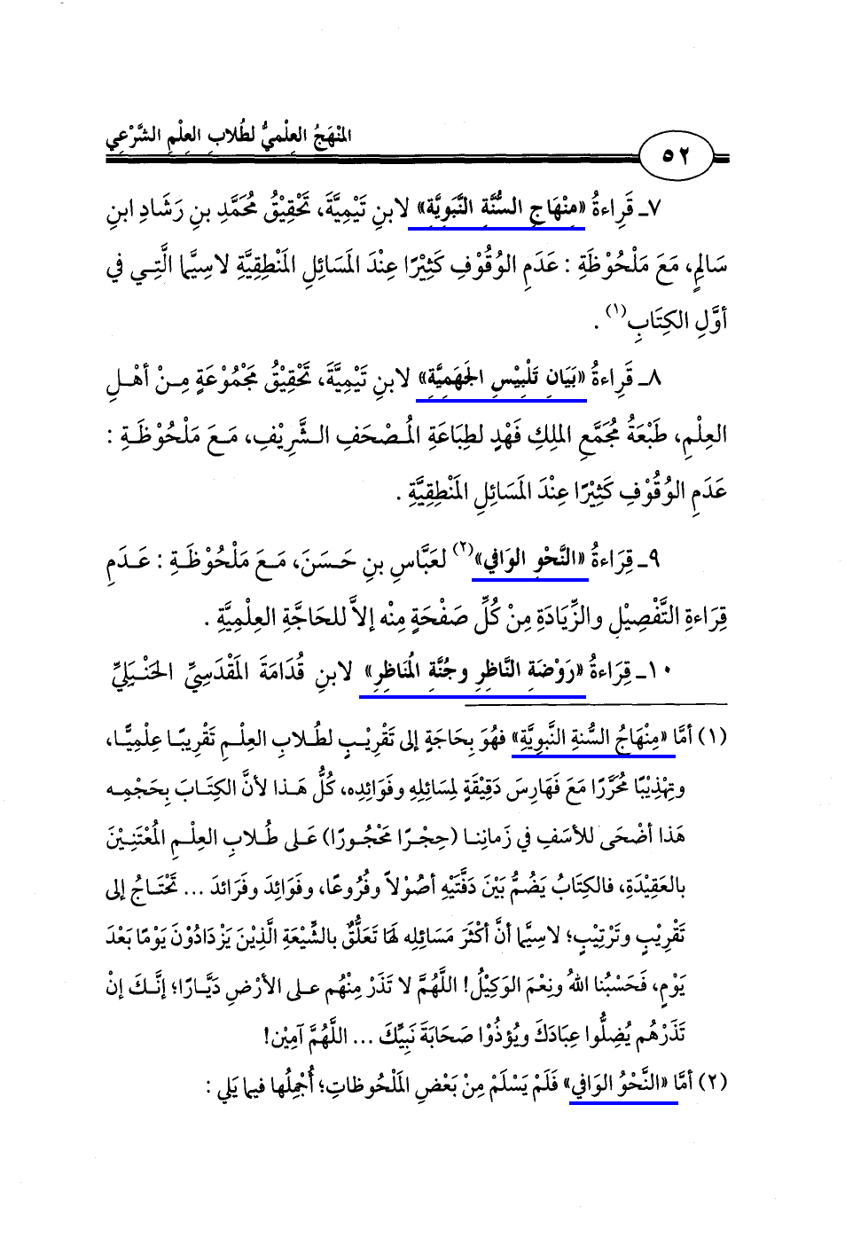 9 - قِرَاءةُ "النَّحْوِ الوَافي" (¬2) لعَبَّاسِ بنِ حَسَنَ، مَعَ مَلْحُوْظَةِ: عَدَمِ قِرَاءةِ التَّفْصِيل والزِّيَادَةِ مِنْ كُلِّ صَفْحَةٍ مِنْه إلَّا للحَاجَّةِ العِلْمِيَّةِ.