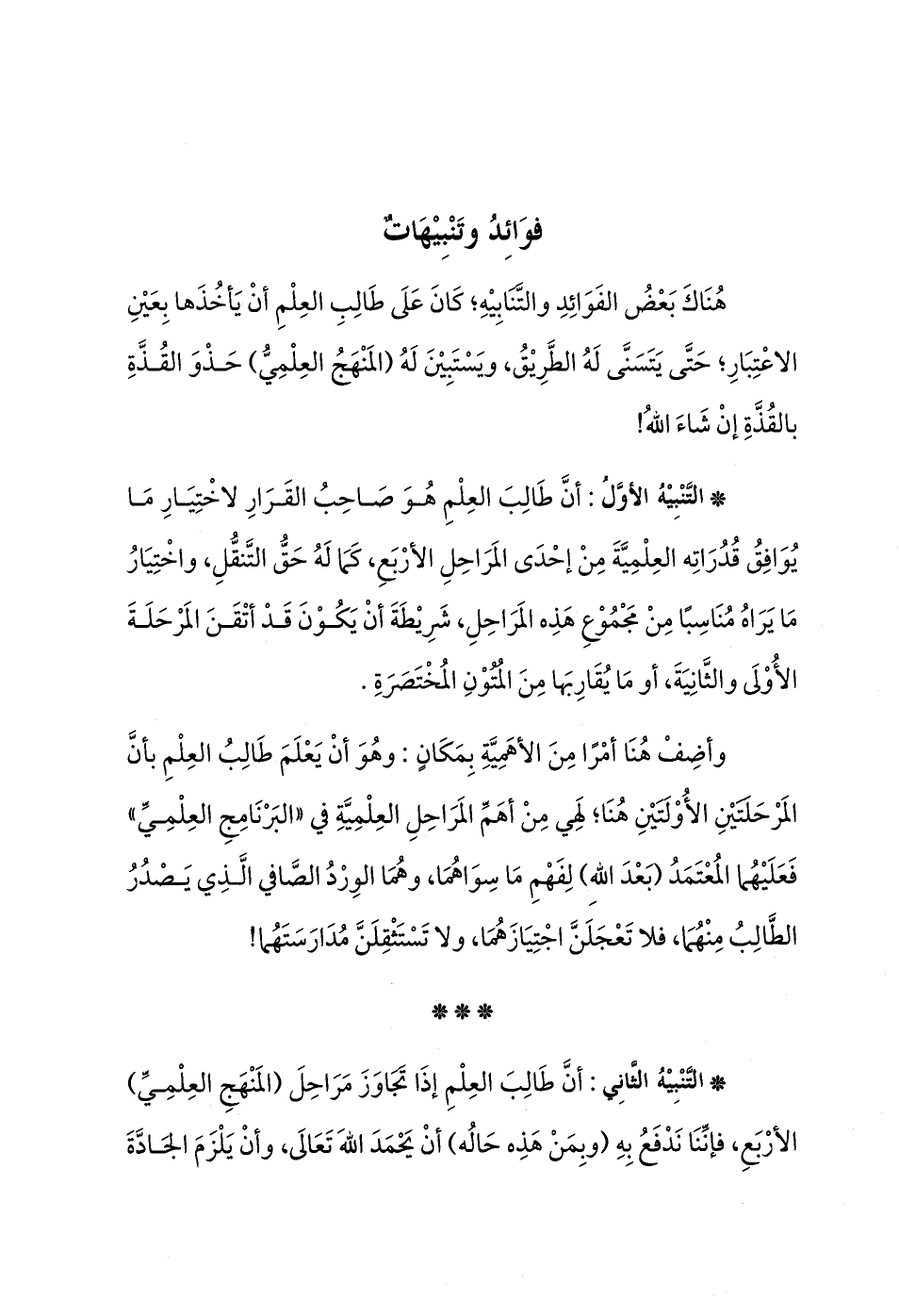 * التَّنْبِيهُ الأوَّلُ: أنَّ طَالِبَ العِلْمِ هُوَ صَاحِبُ القَرَارِ لاخْتِيَارِ مَا يُوَافِقُ قُدُرَاتِه العِلْمِيَّةَ مِنْ إحْدَى المَرَاحِلِ الأرْبَعِ، كَمَا لَهُ حَقُّ التَّنقُّلِ، واخْتِيَارُ مَا يَرَاهُ مُنَاسِبًا مِنْ مَجْمُوْعِ هَذِه المَرَاحِلِ، شَرِيطَةَ أنْ يَكُوْنَ قَدْ أتْقَنَ المَرْحَلَةَ الأُوْلَى والثَّانِيَةَ، أو مَا يُقَارِبَها مِنَ المُتُوْنِ المُخْتَصَرَةِ.