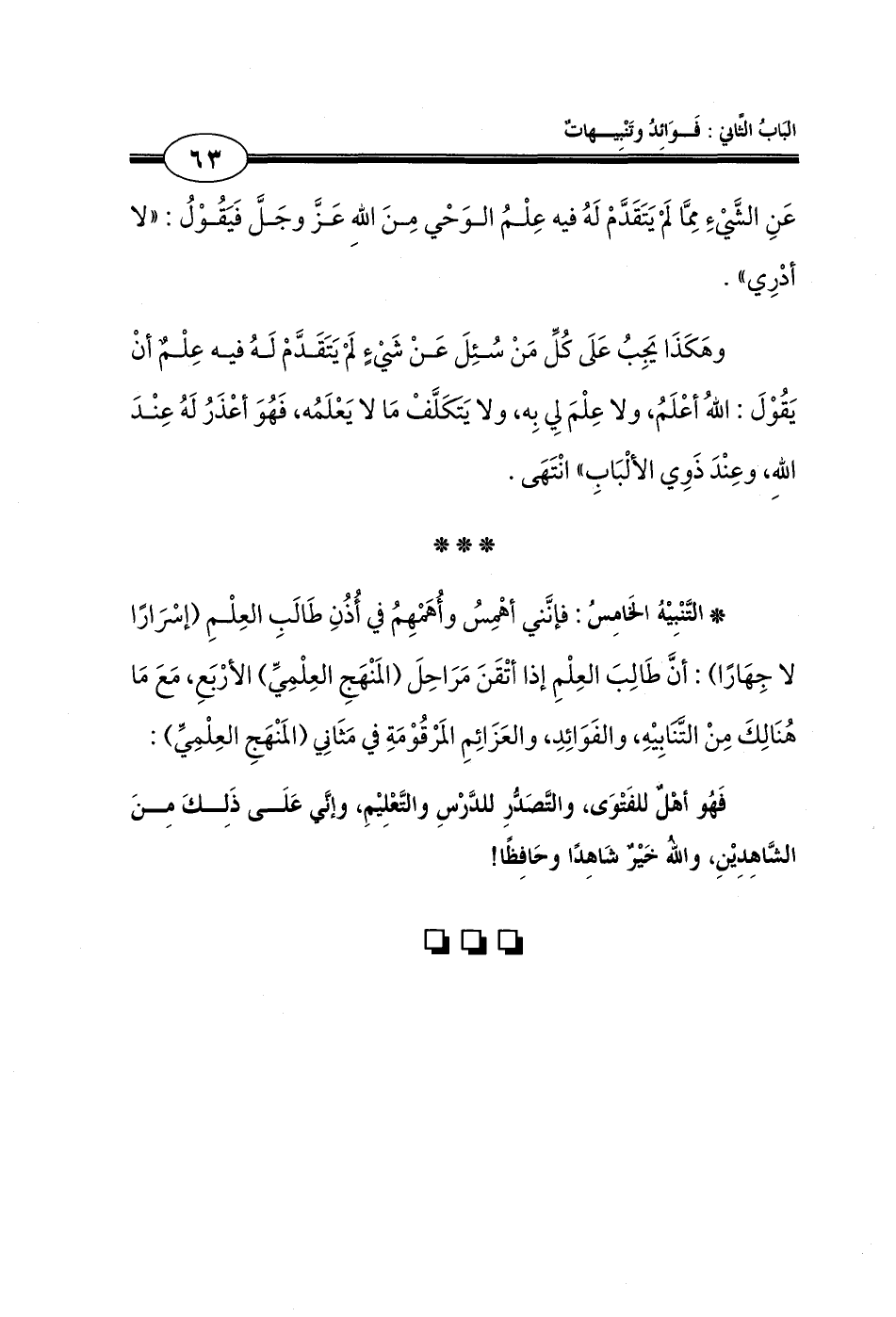 * التَّنْبِيهُ الخَامِسُ: فإنَّني أهْمِسُ وأُهَمْهِمُ في أُذُنِ طَالَبِ العِلْمِ (إسْرَارًا لا جِهَارًا): أنَّ طَالِبَ العِلْمِ إذا أتْقَنَ مَرَاحِلَ (المَنْهَجِ العِلْمِيِّ) الأرْبَعِ، مَعَ مَا هُنَالِكَ مِنْ التَّنَابِيهِ، والفَوَائِدِ، والعَزَائِمِ المَرْقُوْمَةِ في مَثَانِي (المَنْهَجِ العِلْمِيِّ):