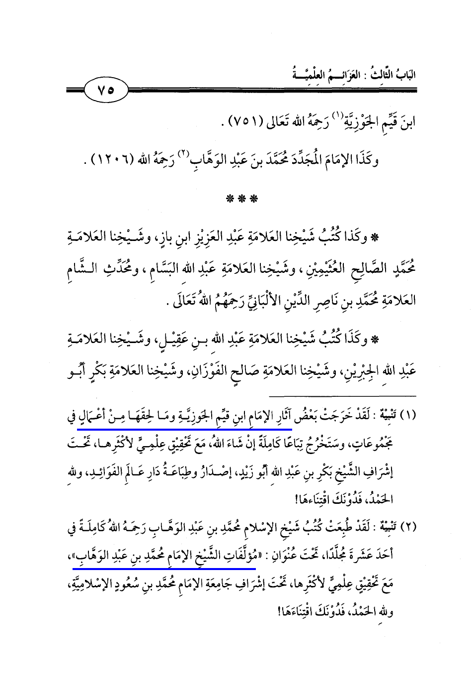 * وكَذا كُتُبُ شيخِنا العَلامَةِ عَبْدِ العَزِيزِ ابنِ بازٍ، وشَيخِنا العَلامَةِ مُحَمَّدٍ الصَّالِحِ العُثَيمِينِ، وشَيخِنا العَلامَةِ عَبْدِ اللهِ البَسَّامِ، ومُحَدِّثِ الشَّامِ العَلامَةِ مُحَمَّدِ بنِ نَاصِرِ الدِّينِ الألْبَانِيِّ رَحِمَهُمُ اللهُ تَعَالَى.