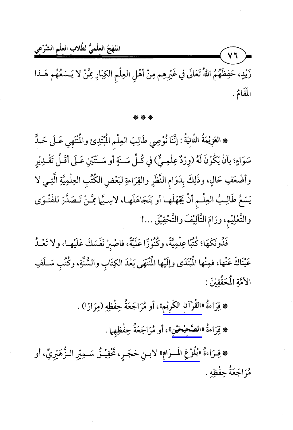 * قِرَاءةُ "بُلُوْغ المَرَامِ" لابنِ حَجَرٍ، تَحْقِيقُ سَمِيرِ الزُّهَيرِيِّ، أو مُرَاجَعَةُ حِفْظِهِ.