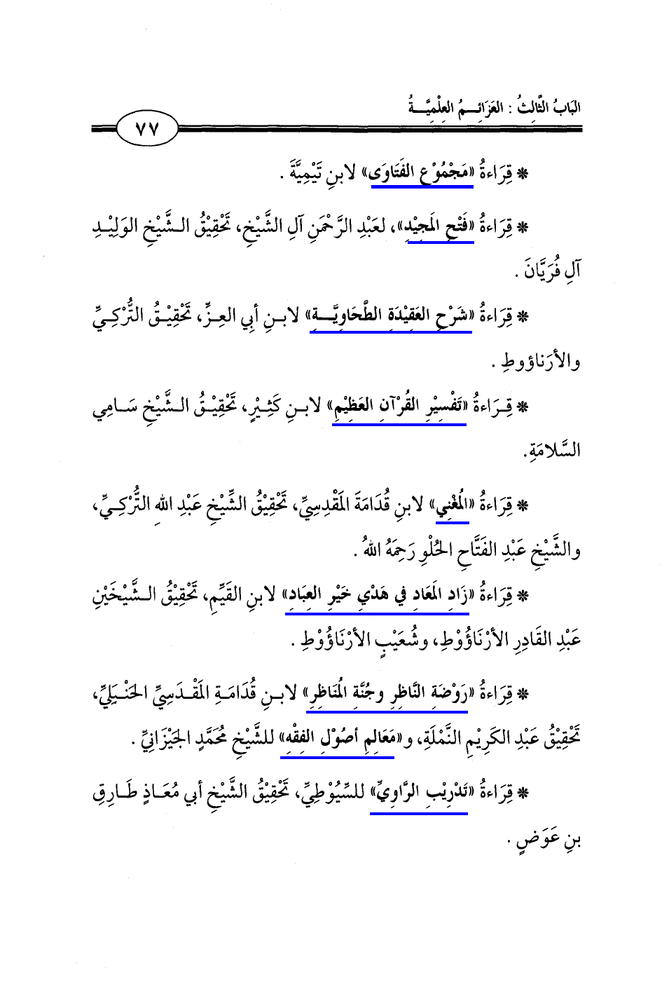 * قِرَاءةُ "فَتْح المَجِيدِ"، لعَبْدِ الرَّحْمَنِ آلِ الشَّيخِ، تَحْقِيقُ الشَّيخِ الوَلِيدِ آلِ فُرَيَّانَ.